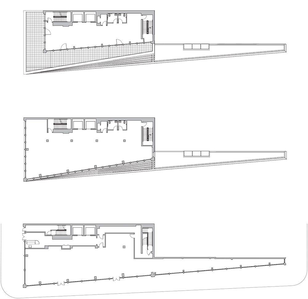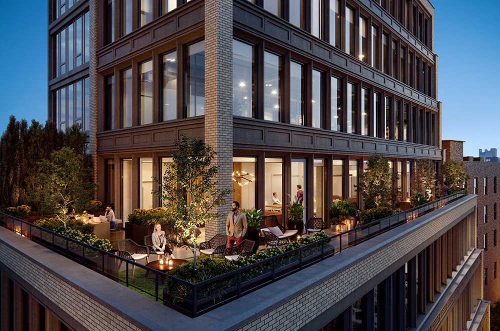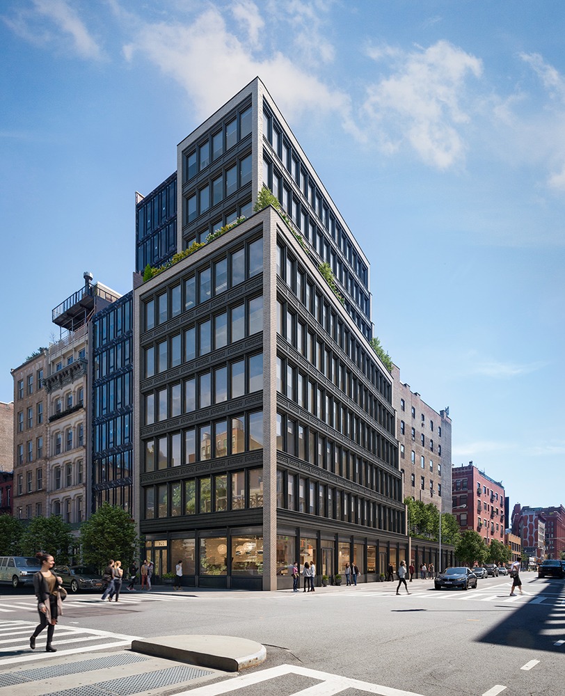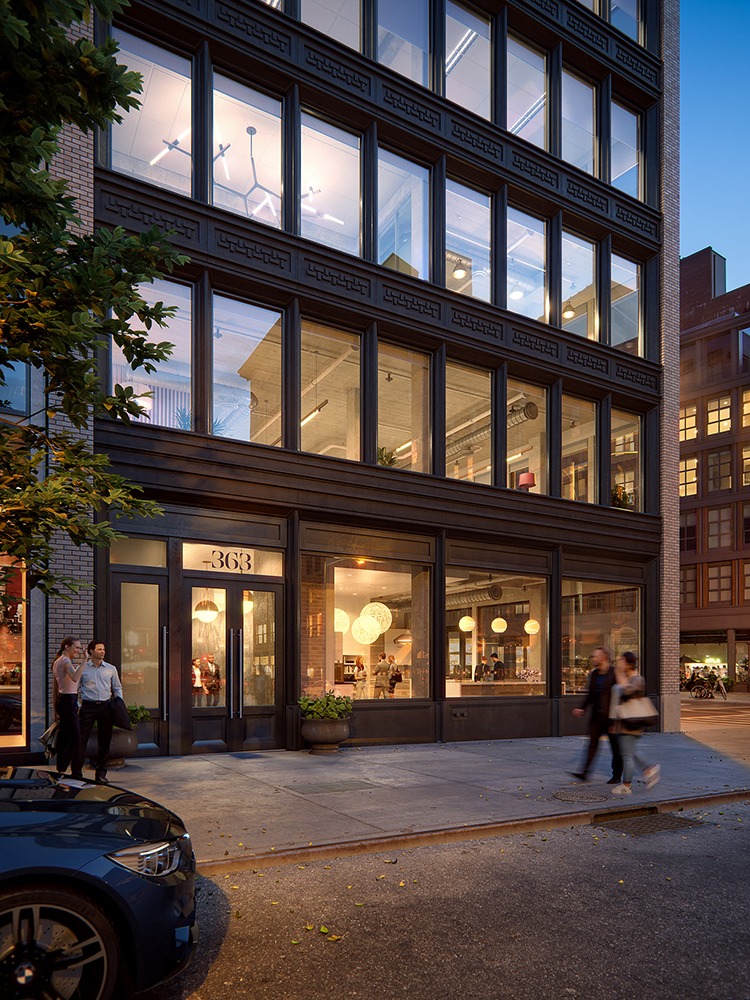 363 Lafayette’s site is prominent, with three visible elevations to the north, south, and west. The ground floor of the building is dedicated to commercial space and extends from Great Jones to Bond Street. Due to zoning and site constraints, the massing of the west facade is set back, with eight floors of office space rising midway through the elevation.