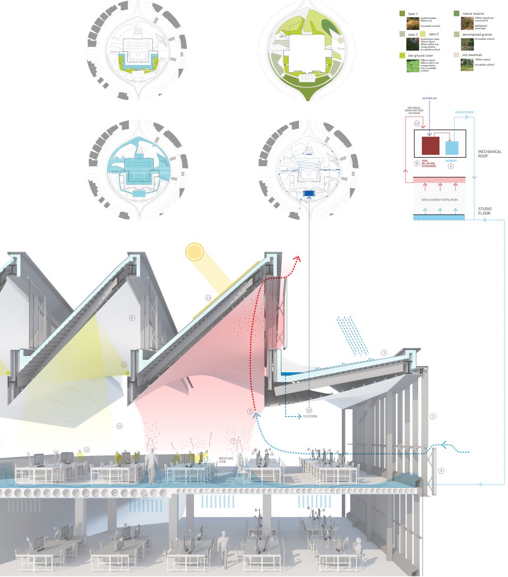 In contrast to the concrete-clad elevations and the cream-colored brick of the historic structure, the north facade of the new school is defined by a sweeping fritted glass curtain wall fitted with aluminum fins. Its corners lift upwards on either end to match the cornice line of the east and west elevations. One of the project’s most striking features is visible from the north; a jagged roofline topped with aluminum that allows daylight to pour into the third-level design studio through rows of diagonal clerestories.