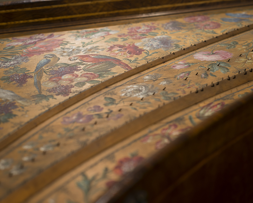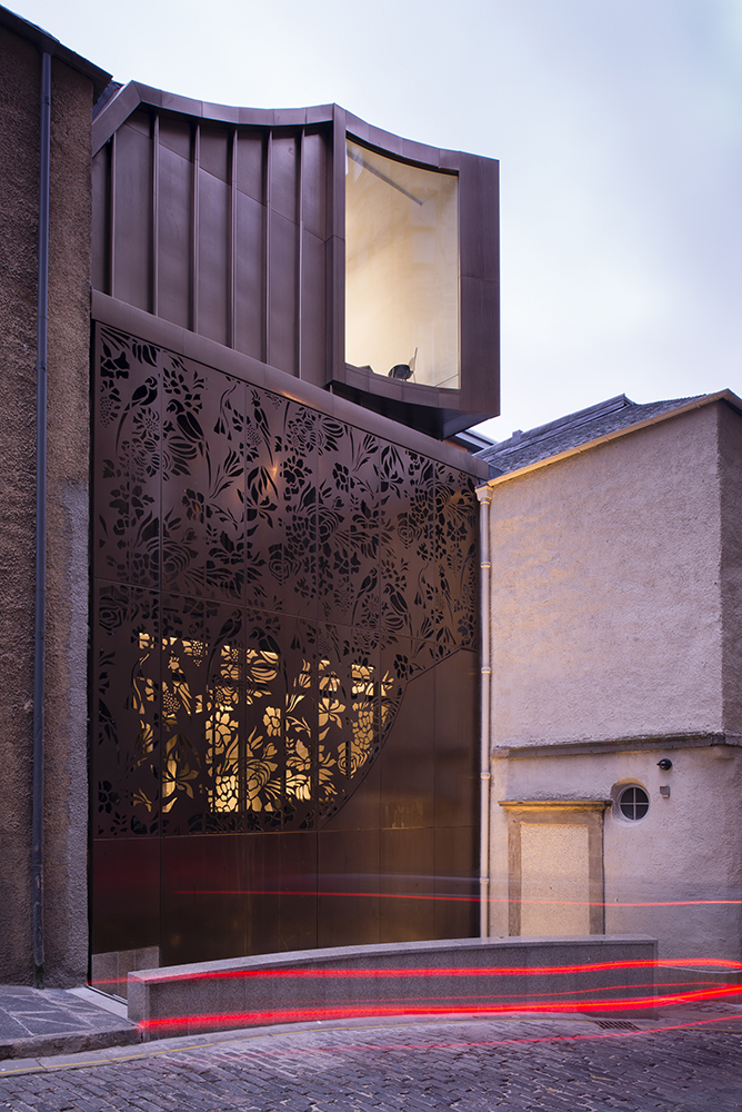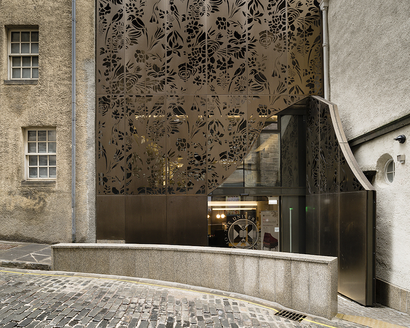 Externally, the boldest design feature is the stainless-bronze eastern elevation. At ground level, the bronze curtain is patterned to resemble the decorative soundboard of St. Cecilia’s Hall’s 1725 Francis Coston double-manual harpsichord. While diverging from the predominantly stone and lime wash character of the area, the stainless steel cladding panels match the massing and rhythm of adjacent window openings. Protruding from the roofline is a bronze stainless steel-clad addition with an undulating gable reminiscent of Victorian flourishes found on Edinburgh’s adjacent High Street. A sweeping concave window is cantilevered from this rooftop addition, peeking North towards the elevated ground of High Street.