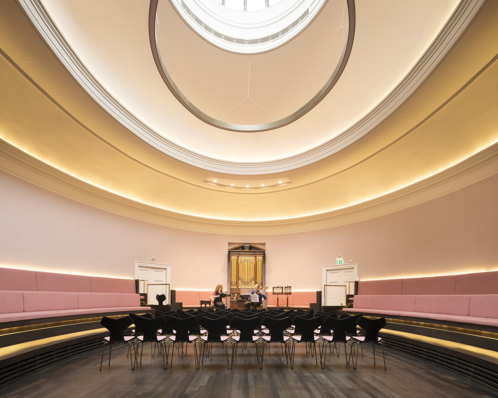 Conservation work included a full program of external fabric repair works, the refurbishment of St. Cecilia’s Hall’s preexisting gallery spaces, and a substantial renovation of the elliptical concert hall. The insertion of glazed openings allows visitors and users glimpses of galleries and open spaces throughout the complex.