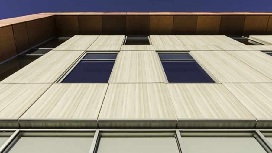 Originally, the system was conceived as 3-millimeter plate panels, but moved to 2-millimeter flush panels, which more appropriately suited the budget. By varying the widths and locations of the panel joints, the team was able to create the appearance of larger panels. The 2-millimeter flush panels were attached to the building structure using #14 TEK 3 Long Life coated exterior fasteners.