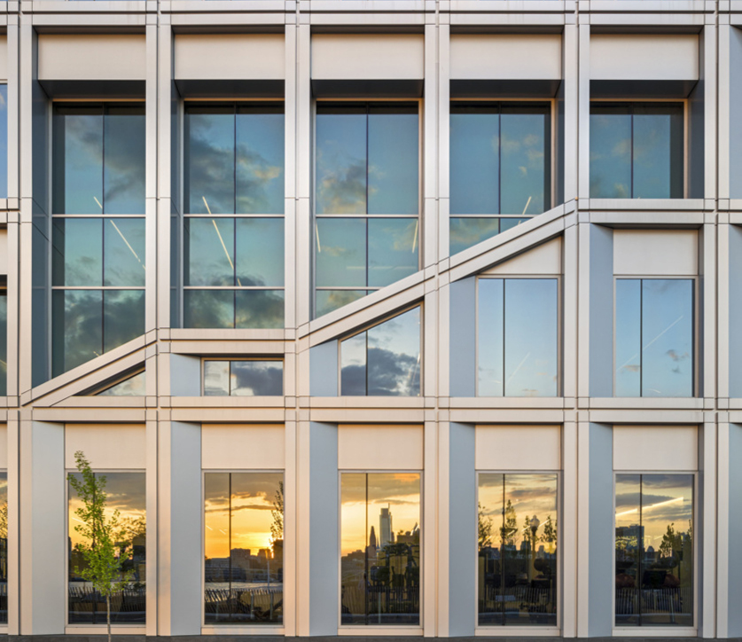 Although composite aluminum is the facade’s primary stylistic element, certain moments break from this material-centric approach. The two entrances, located at the center of the east and west elevations, are denoted by four-story structural glass walls that illuminate the building’s atrium and are on axis with Cooper Street towards the center of Camden.