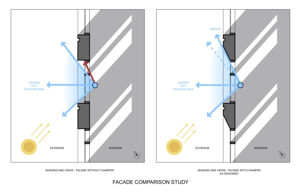 The footprint of the 230,000-square-foot project is narrow and rectangular as a measure to provide the office block with the greatest possible degree of water frontage. The east and west elevations are, as a result, 530-feet-long, highly visible throughout Camden and Philadelphia, and receive a remarkable degree of solar exposure.