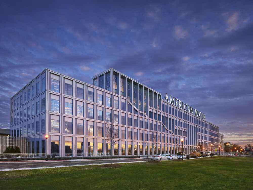 For RAMSA, the material choice of aluminum composite, and its bespoke detailing for the American Water HQ, addressed contextual concerns and performance requirements. “We sought a material with a subtle yet lively reflective sheen to respond to the ever-changing sun and sky,” said RAMSA partner Meghan McDermott. “The color of panels varies from white to silver to dark gray at various times throughout the day, and at sunset, the facade glows with pink and purple tones.” For the design team, it was critical to maintain outward views whilst mitigating solar gain and glare. The use of chamfered and recessed facade panels was a response to this performance requirement, and their design was developed over the rigorous study of sun angles and sightlines.
