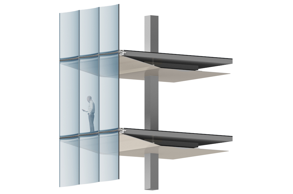 Each floor-to-ceiling panel measures 11′-3″ by 5’—those at the top two floors are 12′-10″ and 12′-13″ tall and form a quasi-cornice above the top slab edge—and have a 9′-6″ radius formed through a heat roller tempering process. The project is topped by a separate row of 4′-tall panels that serve as a parapet. The curvature of the panels also plays a critical role in the office building’s remarkable degree of transparency; the compressive strength of the curves allowed for the panels to be mullion-less, and only supported by brackets anchored to the floor slab and laterally restrained at the head to allow for differential movement. As an additional measure to heighten the lightness of the facade, the structure’s perimeter columns are set back over 12 feet from the glazing to permit nearly undisrupted outward views.