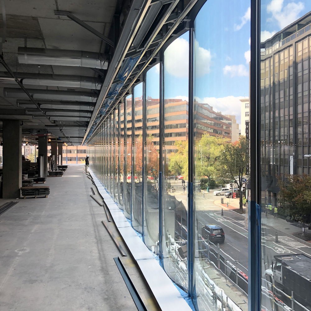 Following REX’s design intent for 2050 M Street, Front Inc. developed a comprehensive system with prescriptive specifications for all aspects of the glass assembly. The design and analysis package was the basis for the facade bid package for prospective fabricators and sub-contractors—Tishman Speyer funded full-scale mockups from each bidder for on-site evaluations by the design team. Ultimately, two firms were signed on to handle fabrication: Tianjin North Glass handled the fabrication of the IGUs cut from Guardian Glass and AGC Asia glass sheets, while Fabbrica managed the aluminum-and-glass modules at their Connecticut facility and handled shipment to Washington, D.C.