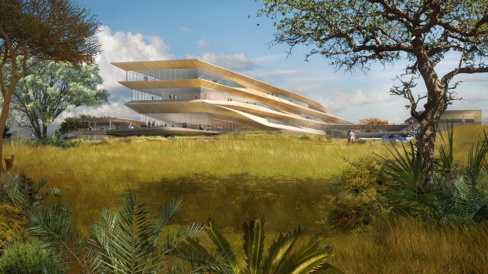 The Botswana Innovation Hub is an ambitious project. The 310,000-square-foot facility is set to be the country’s first LEED-certified building, and environmental performance is significantly impacted by the structure’s complex assembly. SHoP designed an “Energy Blanket” roofscape, which incorporates large overhangs to shade interior spaces and collect rainwater for re-use. Photovoltaic panels are placed across the roofscape to further boost environmental performance.