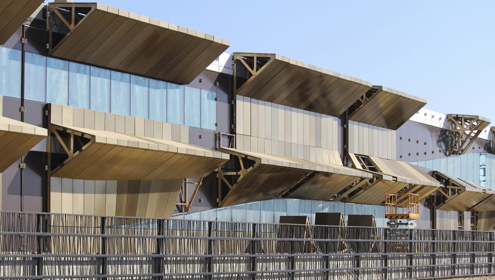 SHoP Architects was awarded the project in 2010 following an international competition, the result of an earlier directive by the Botswanan government to transition its economy from natural resources to intellectual capital and services. In addition to holding symbolic power for the nation, the Hub represents the culmination of SHoP’s research and practice in fully automated direct-to-fabrication and project-tracking techniques largely initiated at the Barclays Center in Brooklyn a decade ago. The approximately 270,000-square-foot complex, which broke ground in 2014 and is due to open next year, seems to hug the contours of the southern African veld. Three low-slung volumes, interlinked at multiple points, are clad with projecting bronze-colored anodized aluminum panels. Slender ribbons of silver-coated window walls course between, and are shaded by, these aluminum canopies. The facility incorporates both passive and active building systems, in addition to landscaping at both the roof canopy and ground-level—strategies that have made it Botswana’s first LEED-certified project.
