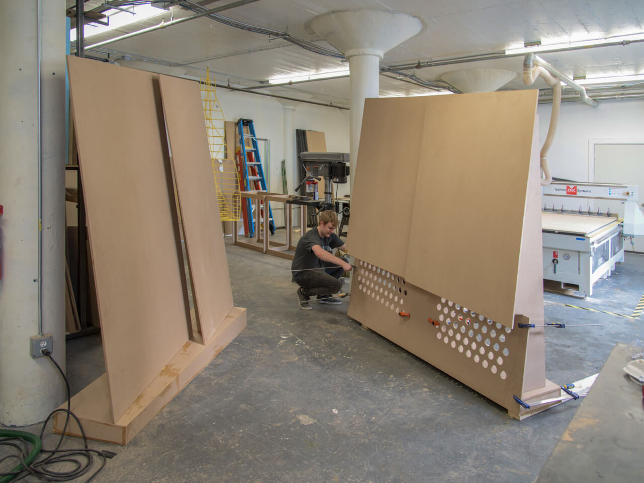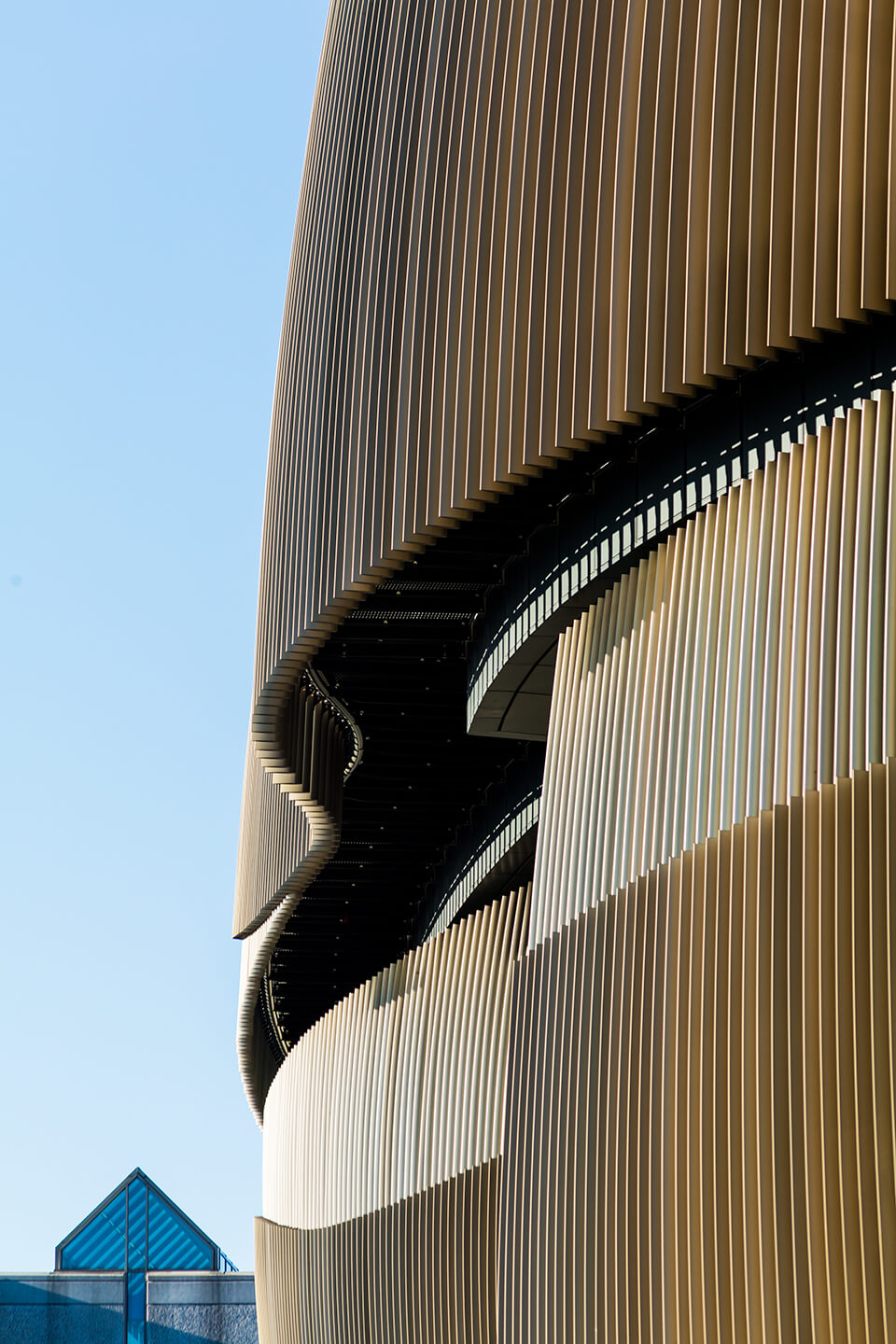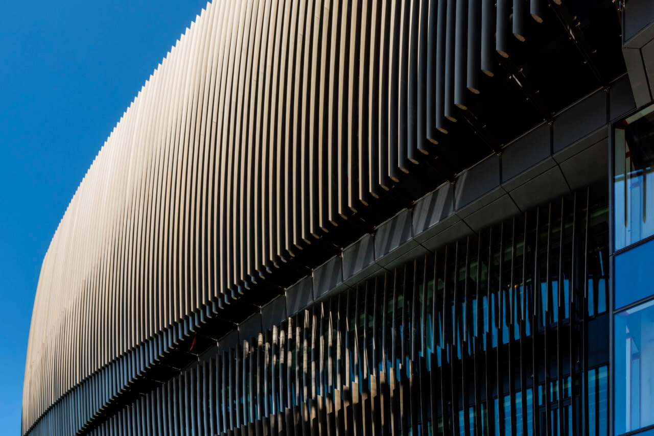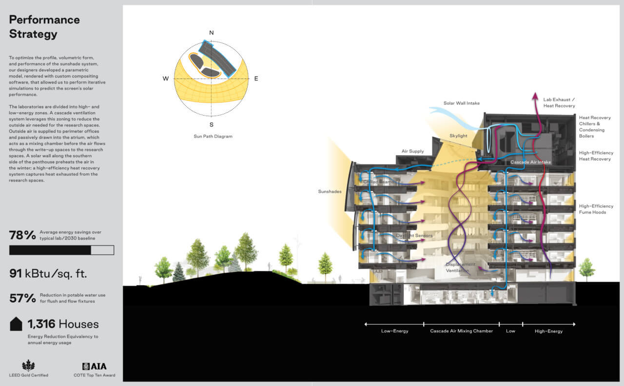 The addition saw an ovoid-shaped, vertically slatted office pod budding from a sleek and horizontally gridded research facility, referred to as the ‘EXP’ building. Both structures are not only connected by the pedestrian bridge—a common and often excessively vaunted feature of educational architecture—but also through the use of faceted glazing held constant in both facades. The new ISEC facade is primarily a triple-glazed unitized curtain wall with two different energy-busting shading systems: extruded and curved bronze fins and a horizontal system of powder-coated aluminum rods hung on the exterior structure. These systems helped achieve an efficiency of 91 kBtu per square foot, a 78 percent decrease in energy use compared to the 2030 baseline. “We didn’t want to just make a pretty building,” said project architect Wesley Schwartz, AIA. “If it was going to look exciting, it would have to be more than skin deep.”
