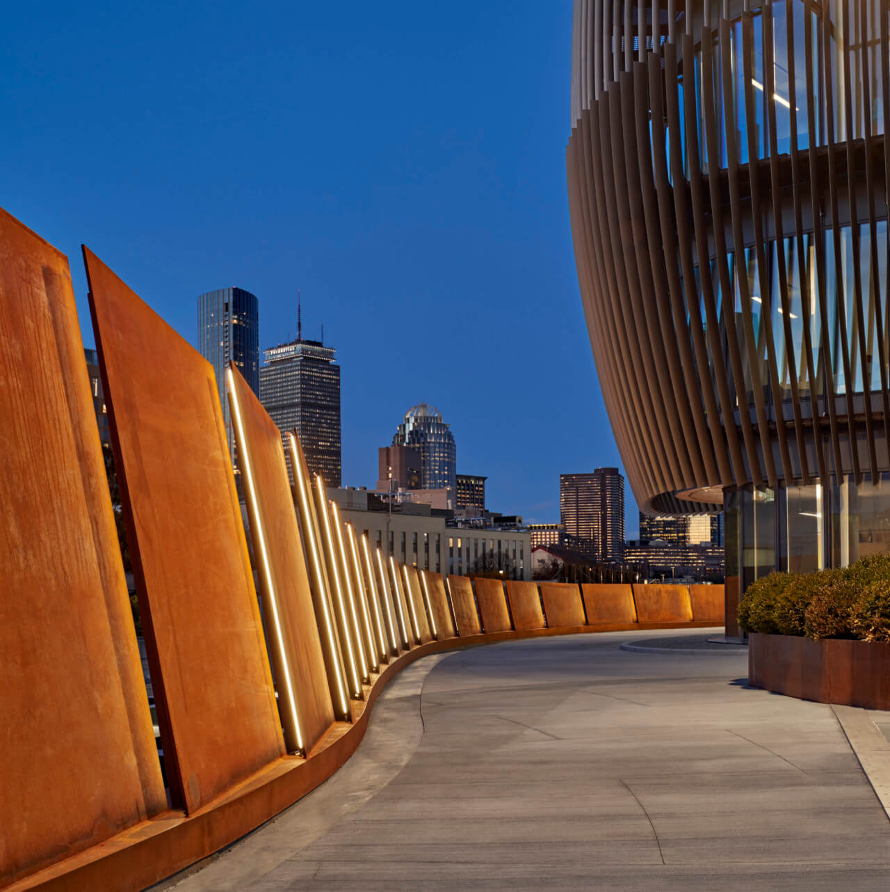 Before the Rhino model was shared with the fabricator for seamless handoff, the design team developed their own custom software to study solar radiation on the enclosure and to refine details regarding performance and dimension. Despite this impressive feat, Kevin Sullivan, a partner at Payette, said that “By far the most difficult part was the pedestrian bridge due to the logistical and technical solutions required to build over active rail lines and its catenary wiring. Testing different fabrication strategies throughout the design and construction process was essential.” The Richard Serra-esque weathered steel plates that line the pedestrian bridge gently slope to form an illuminated pathway between the active railway and its catenary wiring.