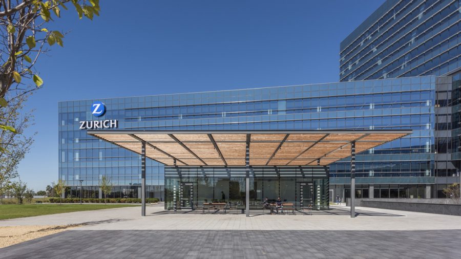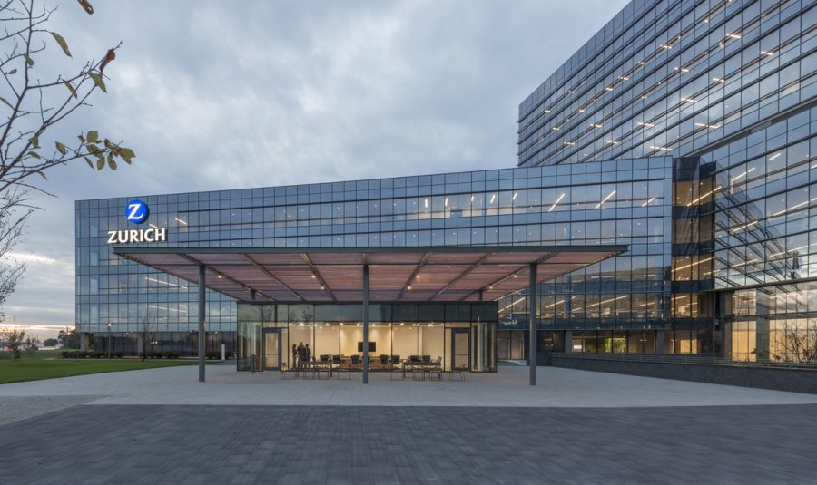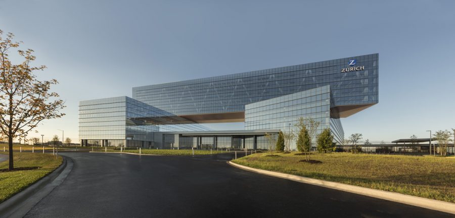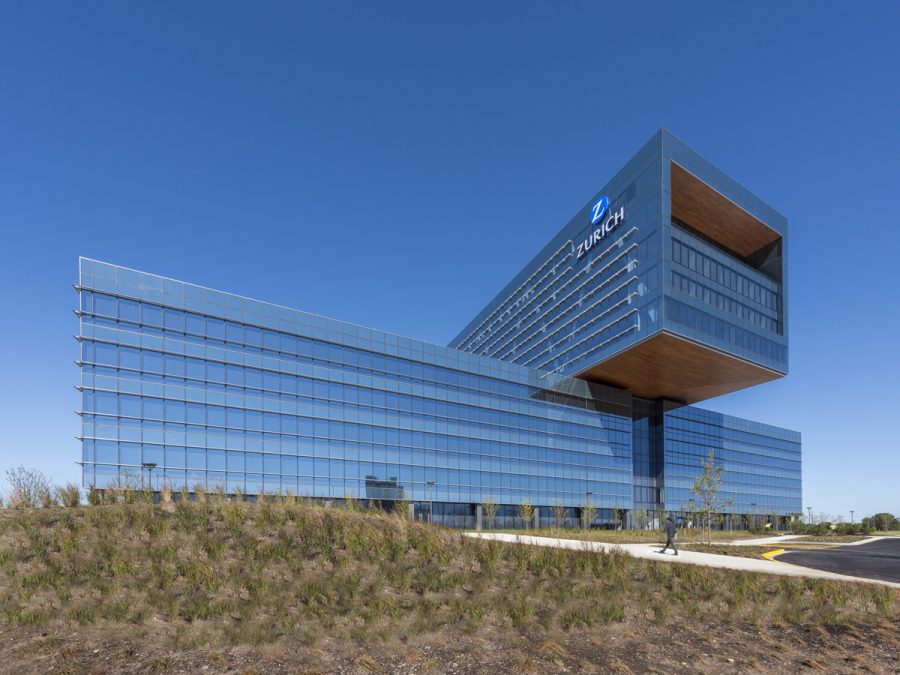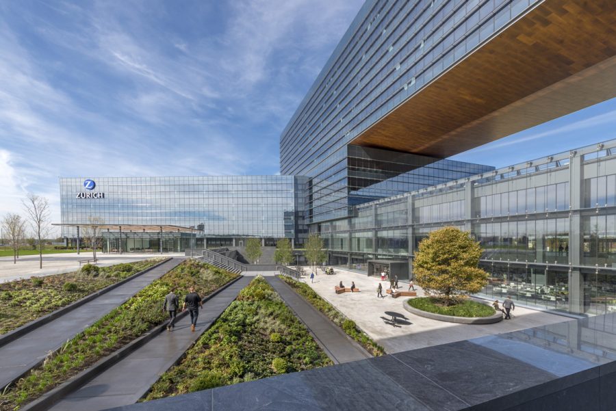Chicago architects Goettsch Partners, along with Clayco and Thornton Tomasetti, among others, have achieved U.S. Green Building Council LEED Platinum certification on a new North American headquarters for Zurich Insurance. The campus, located in suburban Chicago is the largest LEED Platinum Core and Shell v2009 project in the U.S. and the only LEED Platinum CS v2009 project in Illinois. The building achieves a 62.7 percent whole-building energy cost savings, making use of multiple green roofs, energy efficient technologies, rainwater harvest and re-use, accommodations for electric and low-emitting vehicles, and native landscaping with more than 600 trees on 40 acres.