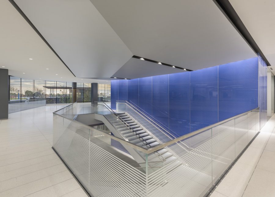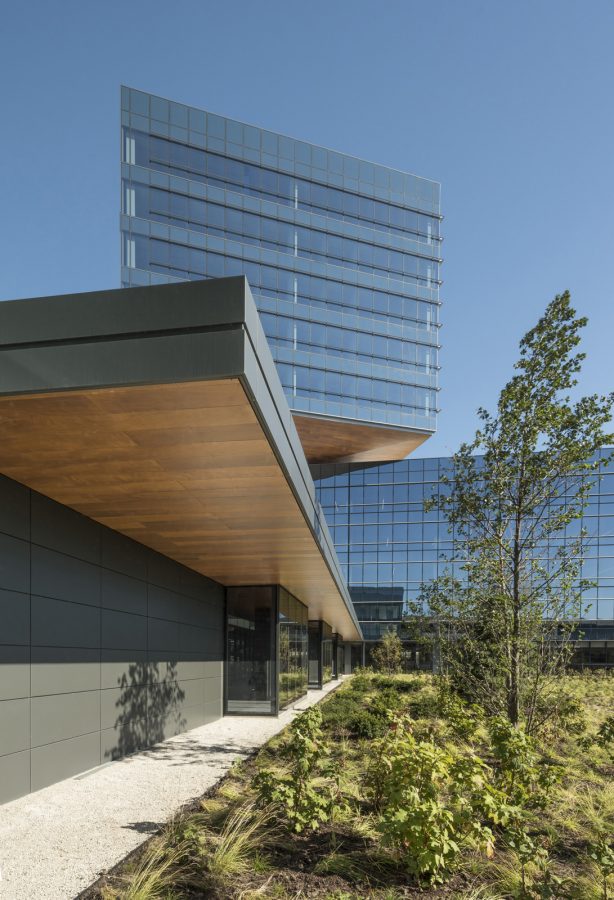 The building is composed of three primary “bars” stacked and arranged to maximize views of the surrounding landscape and optimize solar orientation. The composition is benchmarked off the top volume, which was rotated 22-degrees. Paul De Santis, principal of Goettsch Partners, said this calculated move aligns the building with downtown Chicago, over 30 miles away. “The idea that you are in the suburbs but have a visual connection to the city resonated with Zurich’s leaders.” The lower bar on the east side of the campus is set 90-degrees off of the top bar, which helps to deflect northern winds and buffers sound from a nearby highway. Its rotation allows for direct sun in the courtyard near midday, promoting outdoor campus usage during the lunch hour.
