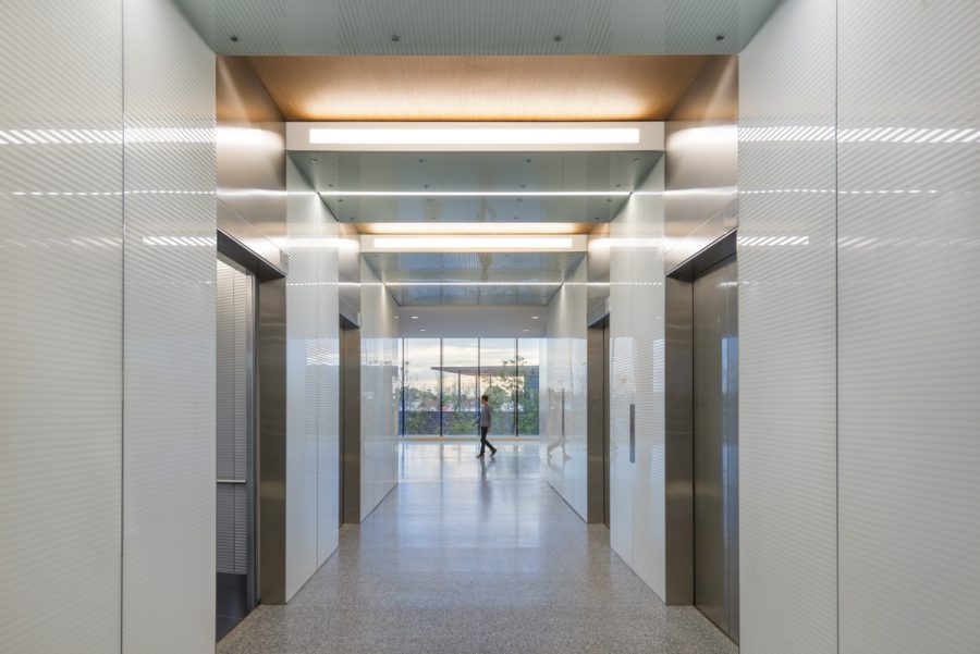 Michael Pulaski, vice president of Thornton Tomasetti, said that their team fine-tuned the glazing characteristics on the building, and custom designed a shading system that reduces peak gains and optimized daylighting. Detailed daylighting studies, using parametric software like Honeybee, were used to evaluate the effects of automated interior blinds and fine-tune the depth of the exterior shading devices for each orientation. The analysis optimized the depth of the shades for energy performance, which reduced peak solar gain for better thermal comfort and the size of the mechanical systems.