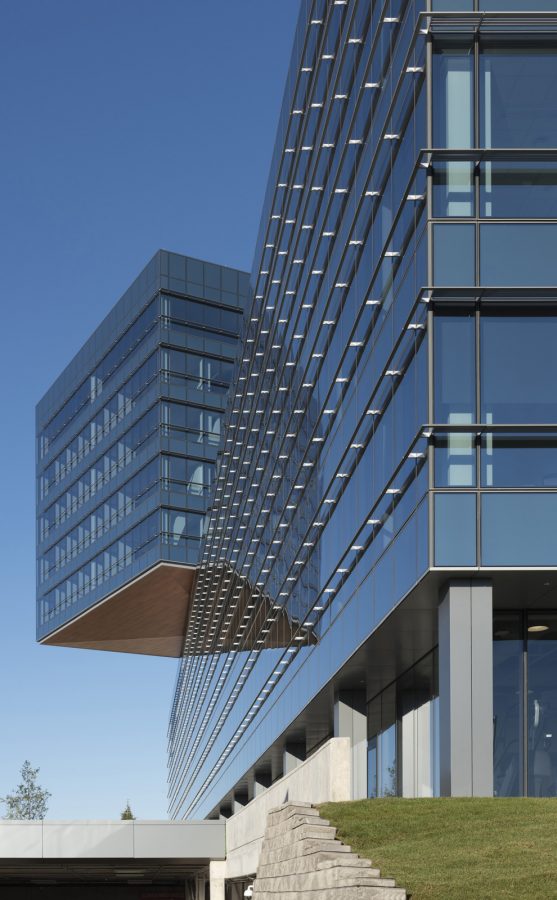 The curtain wall facade wraps outboard of three super scale trusses that are set 60 feet on center, achieving an 180-foot span over the middle of the campus, and a 30-foot cantilever at the perimeter.