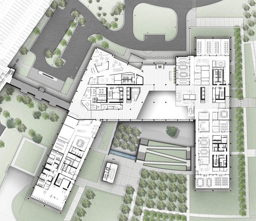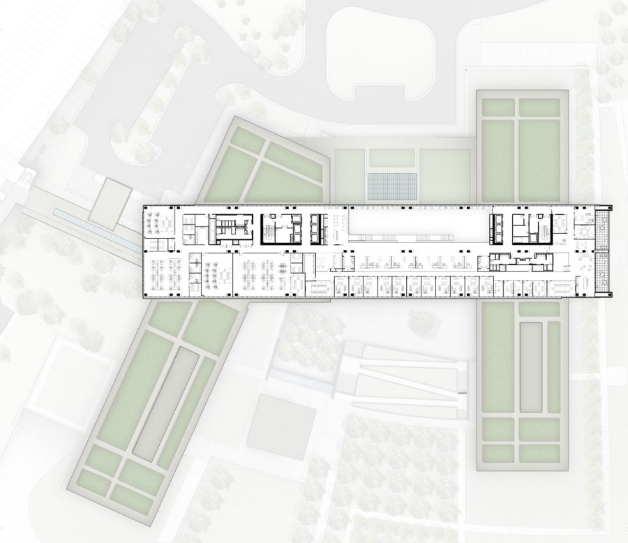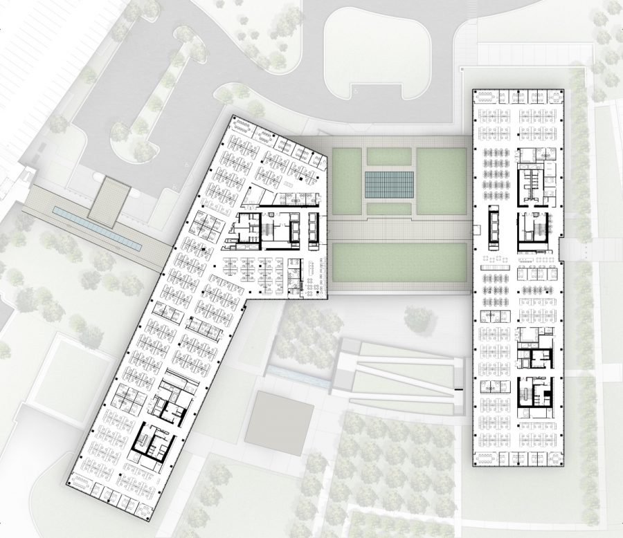 With approximately 2,400 employees moved into the facility, the campus was designed to accommodate up to 2,800 employees. De Santis said the two lower bars are designed to extend an additional 100-linear-feet if and when more space is needed in the future: “It’s very rare to work on a 26-acre site. We’re used to working in very urban conditions. So the idea that the land allows for some of these growth strategies is very natural for the project. The longer these bars get, the more elegant the architectural expression will be.”
