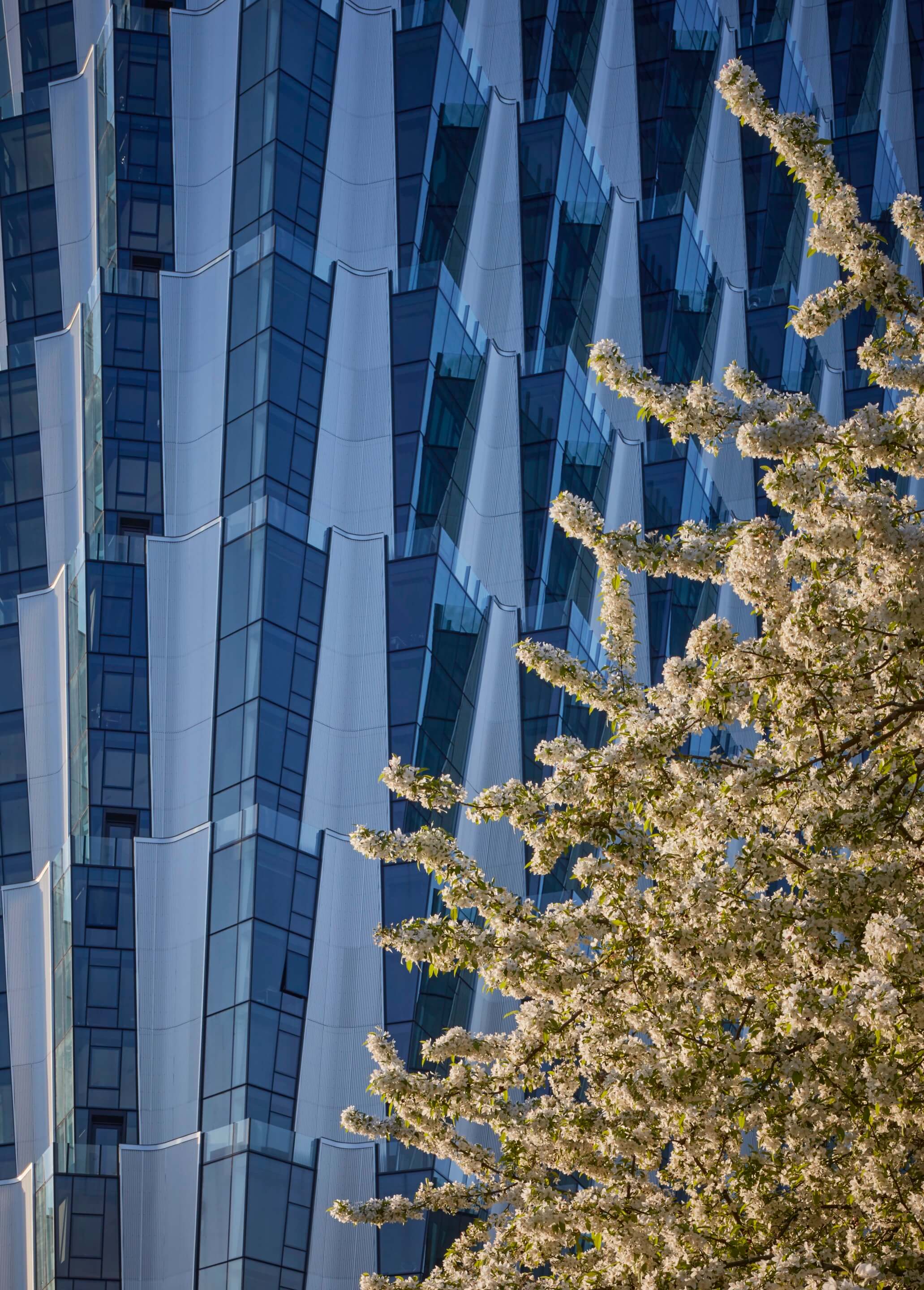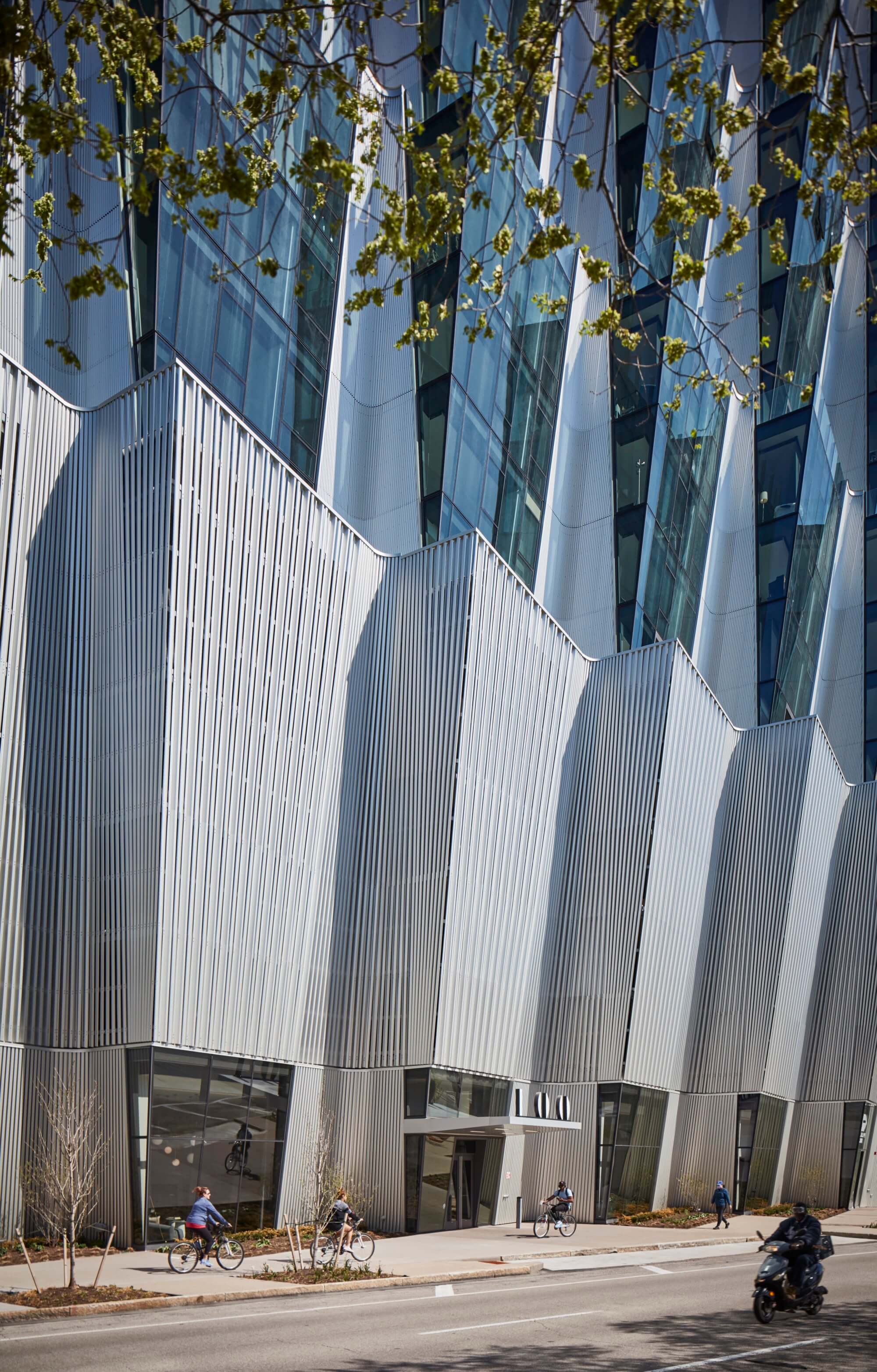 There are echoes of the art deco stylings of the nearby Park Plaza Tower, and in the late-afternoon light, the glass-and-metal envelope—a combination of curtain walls and corrugated anodized aluminum cladding—takes on a golden hue.