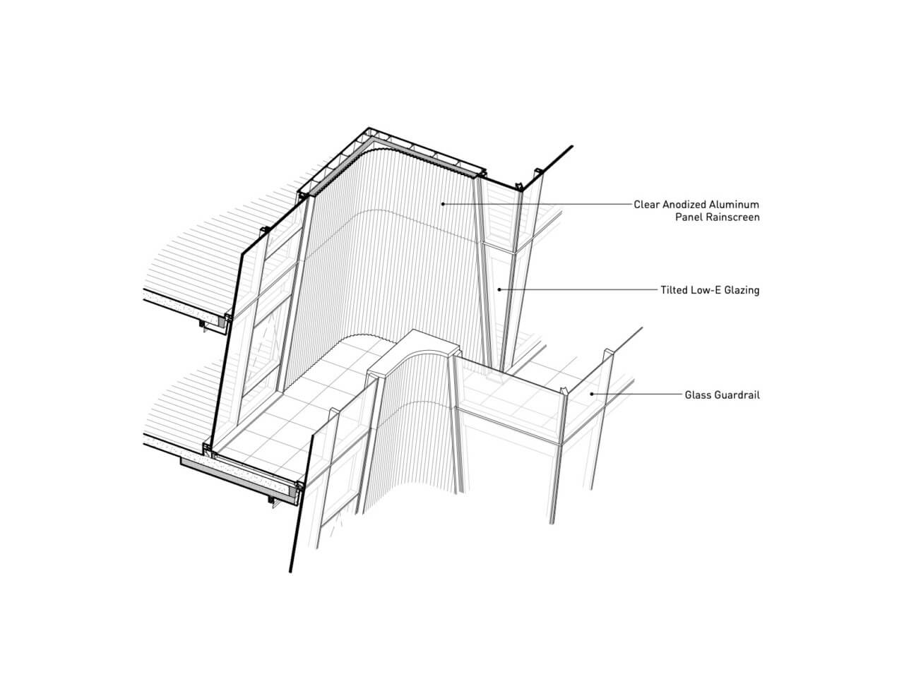 At their longest, the cantilevers span nearly six feet, which becomes the width of the outdoor terraces that terminate the glazed tiers. These mostly private balconies are hemmed in by glass railings and aluminum elements of the facade; consultants Studio NYL ensured thermal breaks in between, so these safety features wouldn’t become hot to the touch during summer. The canted unitized curtain wall system incorporates argon-filled insulated units with a low-e coating and standard elements including operable awning windows and glass doors. The latter required more detailed articulation to ensure geometric compatibility with the wider panel system. “There’s always this dynamism and changing edge-of-floor condition that the angled facade needs to meet,” said Christopher O’Hara of Studio NYL. “That was the biggest challenge of the project.”