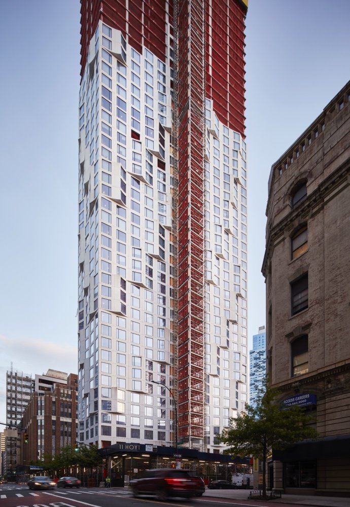 Since rezoning under the tenure of Michael Bloomberg, Downtown Brooklyn has undergone a tremendous transformation from a relatively low-slung commercial district to a burgeoning neighborhood defined by row upon row of residential towers. 11 Hoyt, located on the southern boundary of the district, is another addition to the area set to be completed in 2020. The tower, developed by Tishman Speyer, is Studio Gang‘s first residential project in New York City and breaks from the fairly lackluster design typology of the area with a unitized curtainwall of scalloped precast concrete panels.