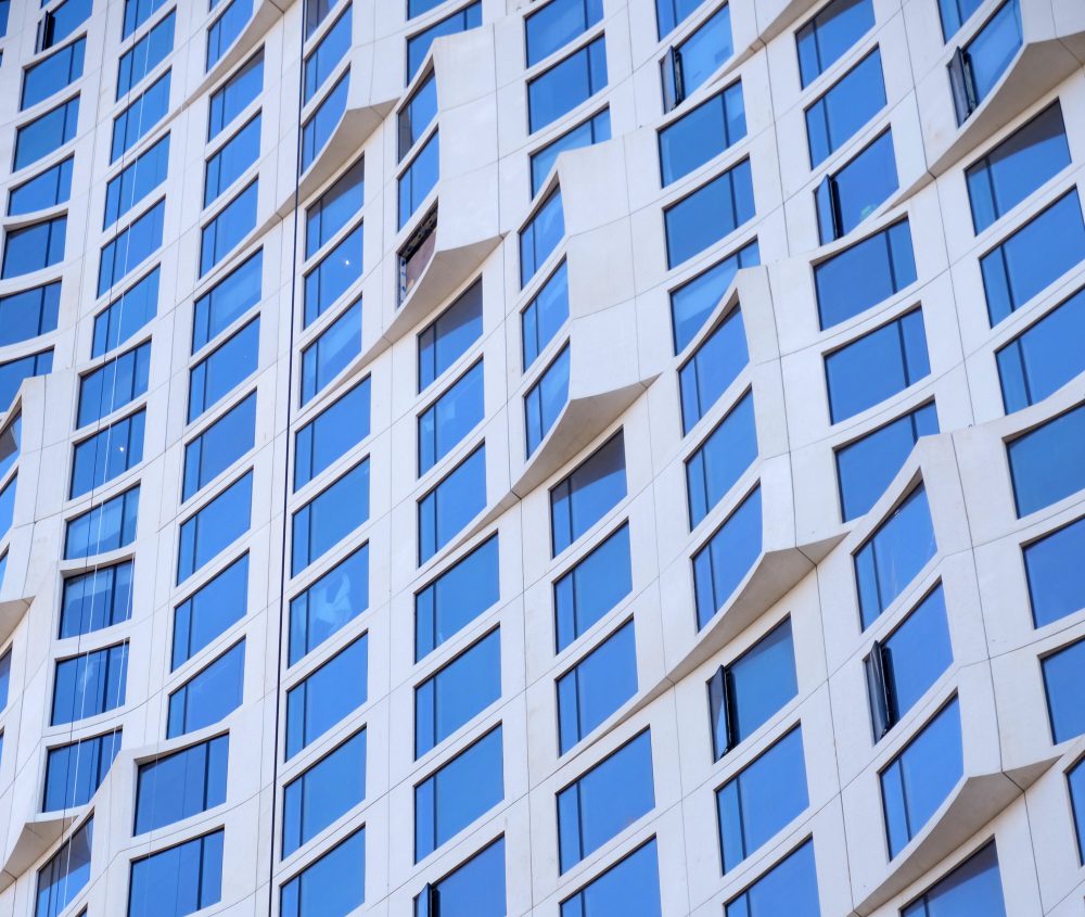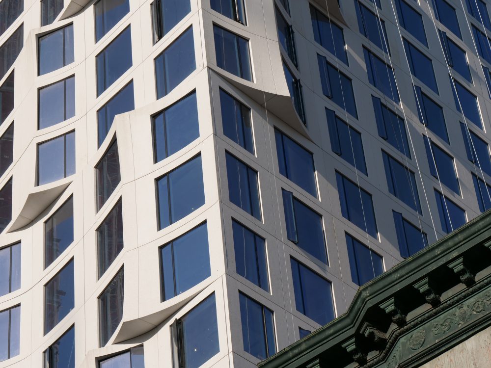 The approximately 1155 precast concrete panels were produced by Canadian manufacturer Bétons Préfabriqués Du Lac (BPDL), and measure just under twelve feet in both height and width. The panels are composed of white concrete with a thin veneer of light grey calcite. They are arranged in seven sweeping undulations along the east and west elevations, and three to the narrower north and south elevations, creating diagonal strands of bay windows that protrude from the otherwise flush curtainwall. According to Studio Gang senior project leader Arthur Liu, “the design process and digital design tools helped create a small number of discrete facade elements arranged in a way that offered variation and flexibility to the design of the facade while simultaneously aligning with interior spaces and respecting the limits of constructability.”