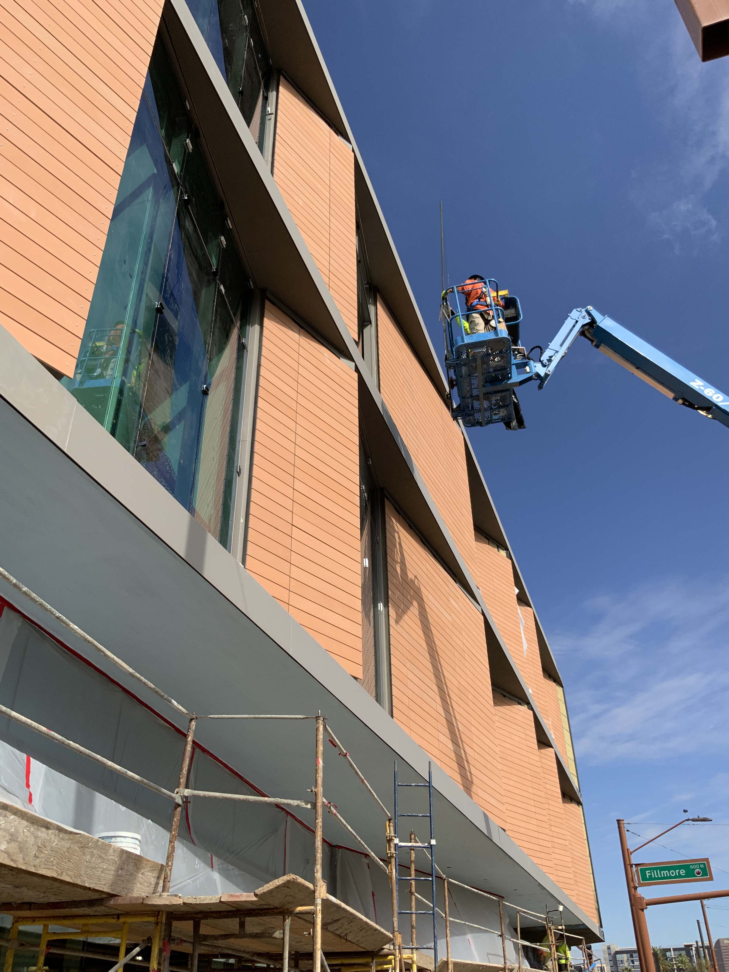 Studio Ma worked closely with TAKTL to develop custom panels that were consistently six inches high but varied in length, to allow for panel joints to align to cladding joints in the tower and masonry courses in the base. The panels were installed over Thermafiber’s mineral wool continuous insulation, with both concealed and exposed stainless-steel fasteners, depending on the panel’s location on the building. Additionally, the panels act as slats for custom, floor-to-ceiling sliding screens, which offer protection from extreme sun angles that often render shading elements ineffective on east-facing orientations.