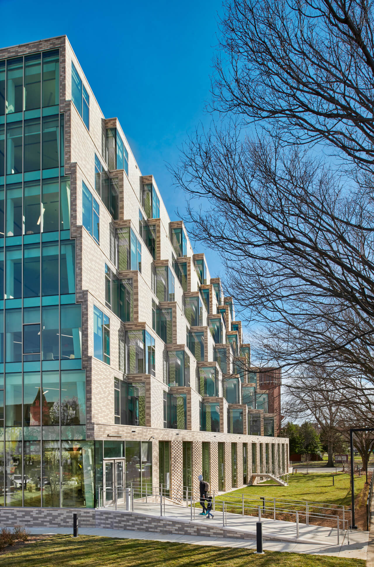 The building was constructed on a post-tensioned concrete structure to avoid placing columns in the corner of the ziggurat-shaped massing. These cantilevered corners quietly hide structural elements to allow for the unobstructed viewshed along LEnfant’s Delaware Avenue, an original arterial street from the French urban planner and architect who designed the Washington, D.C., city grid. Thoughtful design led to separate entrances for the short-term housing and existing clinic, something neighbors wanted to reinstate for the new project.