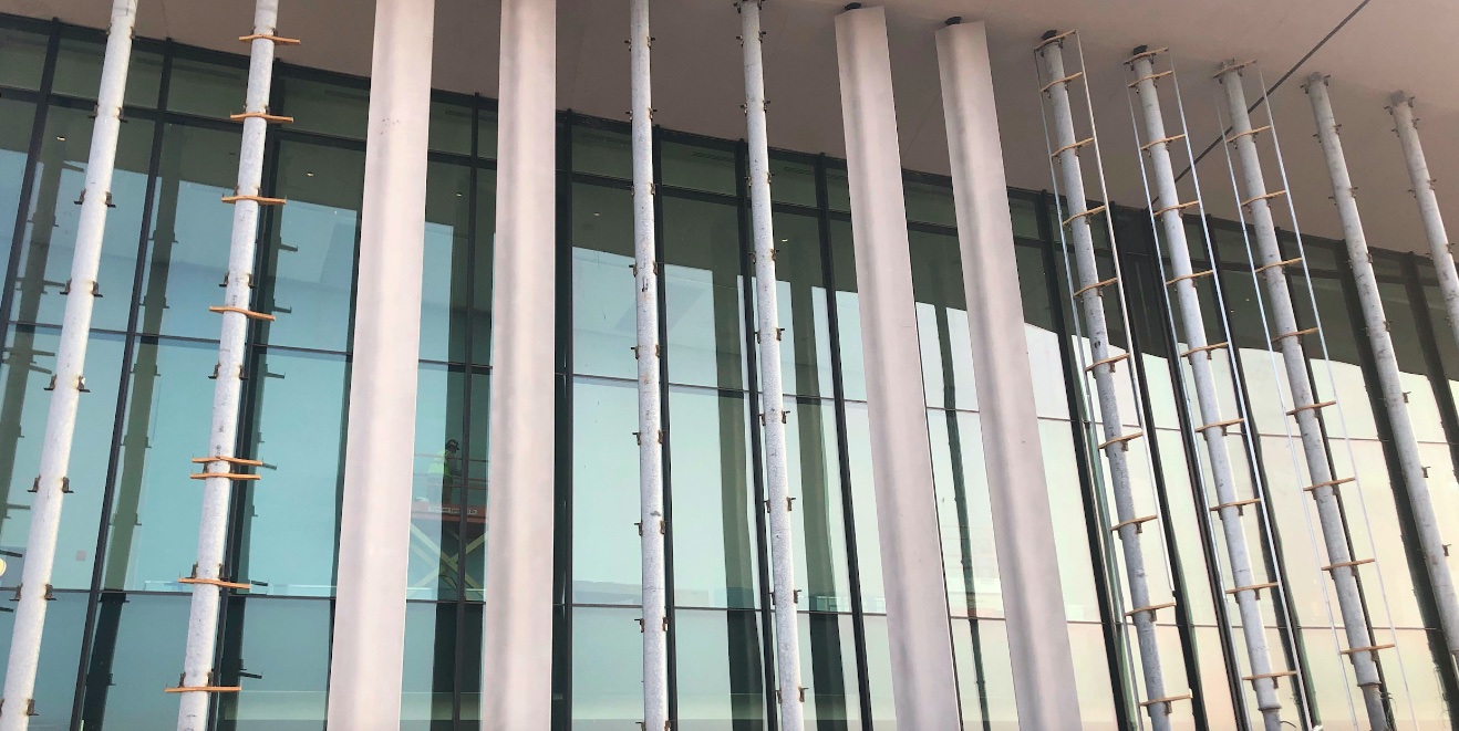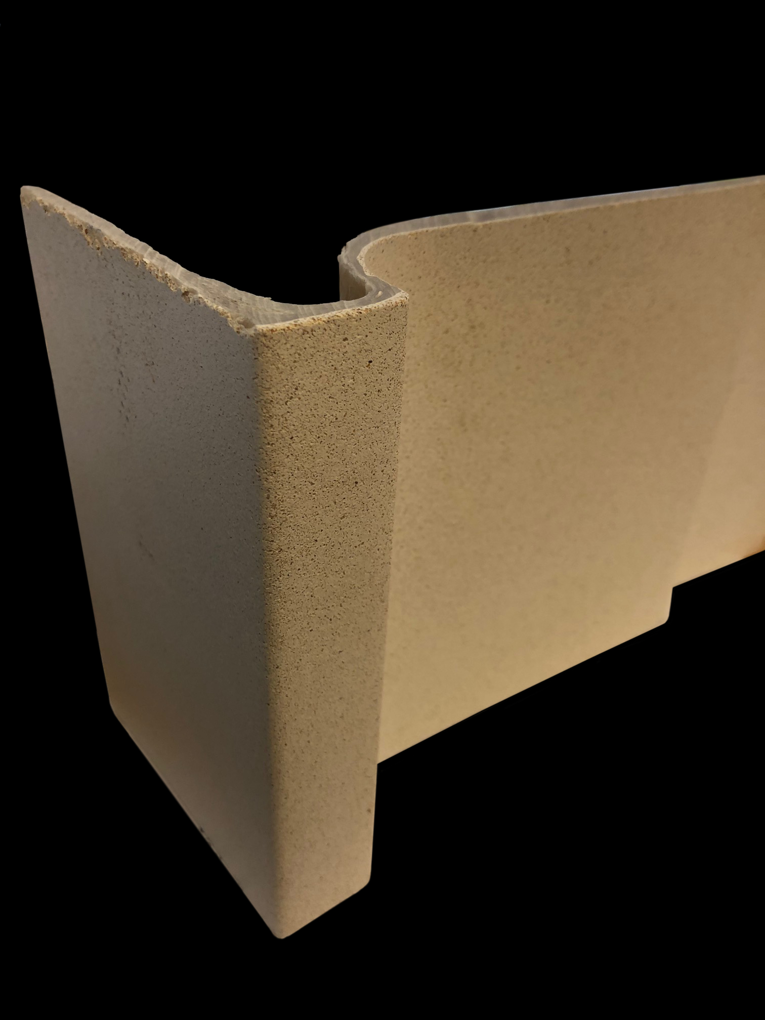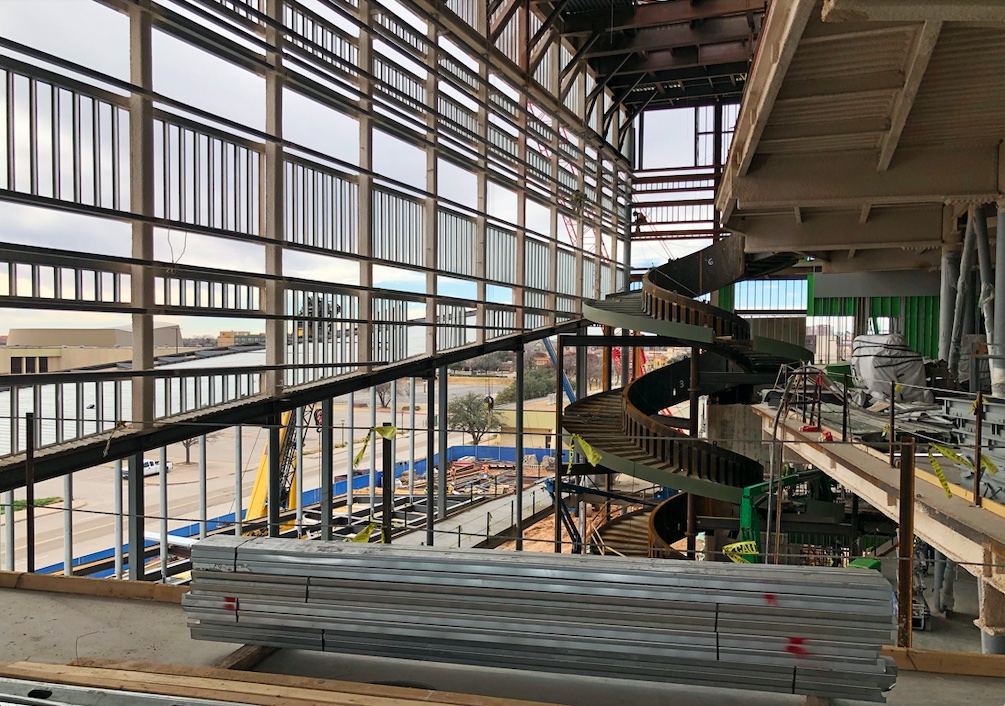 The contemporary facade’s sleek design is reminiscent of the flat, regional landscape, particularly the horizon and layered rock formations of the Texas canyons. Walking to the entrance, the undulating fins seem to float. Hung 5 feet off of the curtain wall, they create a walkable arcade stemming from the design intention to intertwine outdoor and indoor programming. Each fin in plan profile is 2′-6” by 9′-1/4′. Originally designed in concrete, the precast options were found to be too heavy and not slim enough to support the intricacies of the lighting system found in each fin. Diamond Schmitt worked extensively with Fiblast Alabama to arrive at an intermediate solution in the design-assist process: glass fiber reinforced concrete.