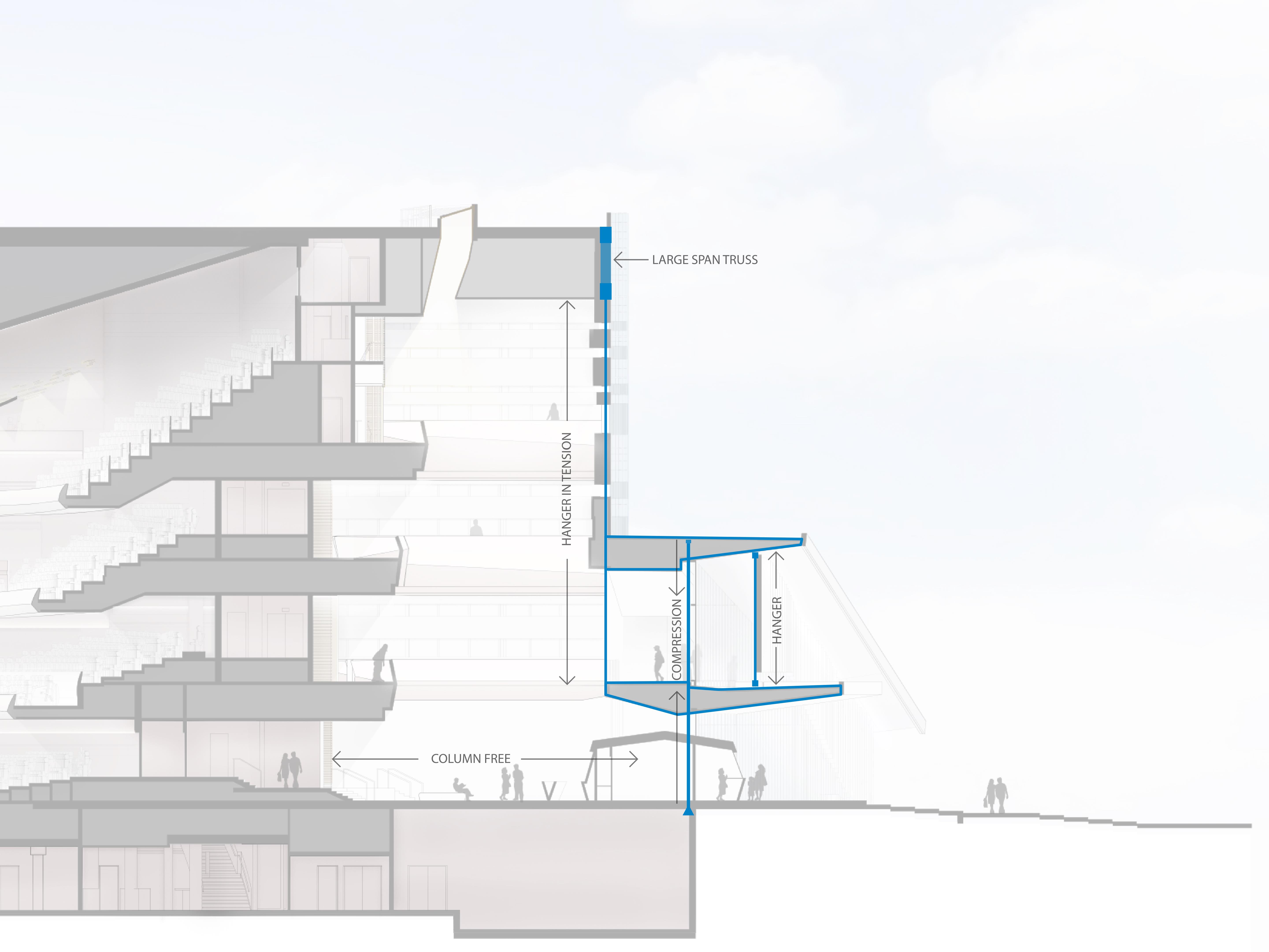 Lastly, the columns supporting the esplanade at the lowest sloping edge of the site are a particularly inspiring feat of engineering. Hung from the first story facade, the overhang covers an outdoor amphitheater space for performance and encouragement of gathering at other times. The poured concrete columns are massive in scale and stem from one spot in the ground only to slope at a dramatic angle in support of the facade’s final overhang.
