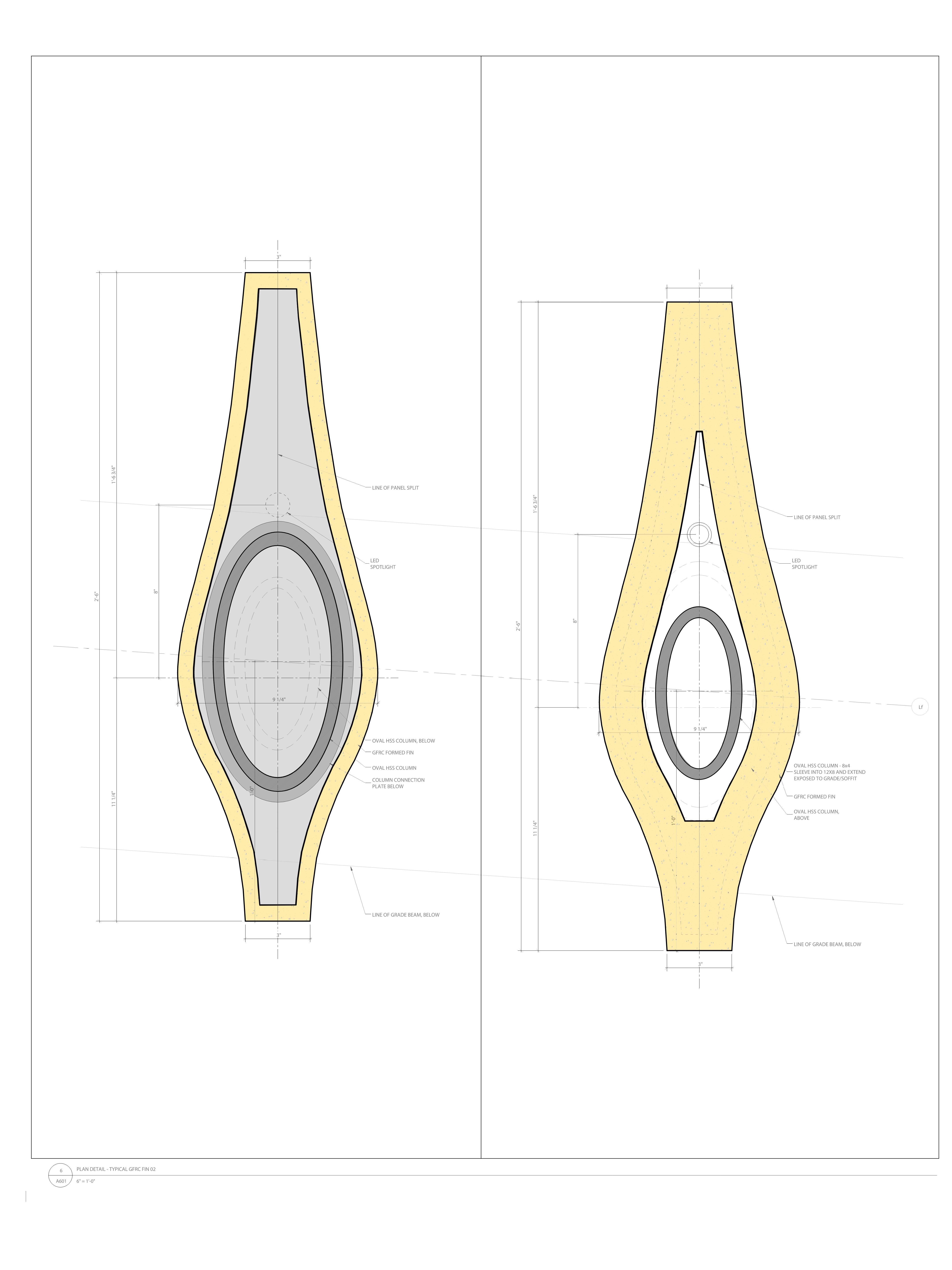 The fiberglass resin has a proprietary coating that mimics precast concrete and allowed for both the unique structural condition of the facade’s overhang as well as the wiring for light fixtures that highlight donor plates set in the floor beneath along the arcade. Each fin is actually two halves cast around a steel beam, completely supported from above while the beam ensures lack of movement during strong winds. The halves show a clean reveal as they rotate in their array from left to right. The 1:1 rotation creates a tempo similar to Eadward Muybridge’s locomotion photos from the 1800s or, for a more contemporary example, a GIF.