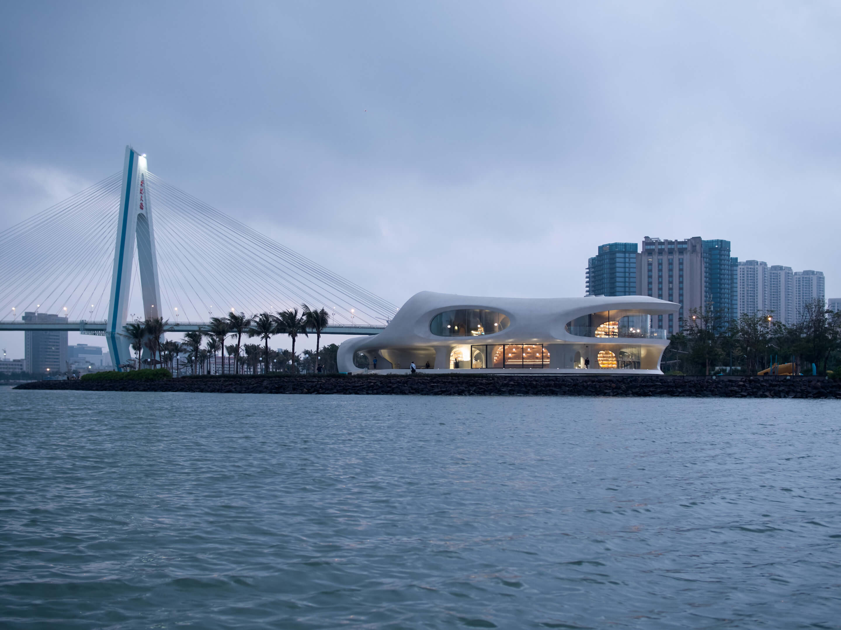 The Cloudscape of Haikou opened on April 21st, 2021, welcoming users and park visitors from the coastal city of Haikou, China, to the intimate library and waystation. Commissioned by the city’s Tourism and Culture Investment Holding Group, the sinuous concrete Cloudscape is the first of 16 coastal pavilions that will be built to rejuvenate the public space along the coast of the historic port city. MAD Architects’ biomorphic, two-story organic form consists of 11,000 square feet of space for reading, a cafe, and bike storage.
