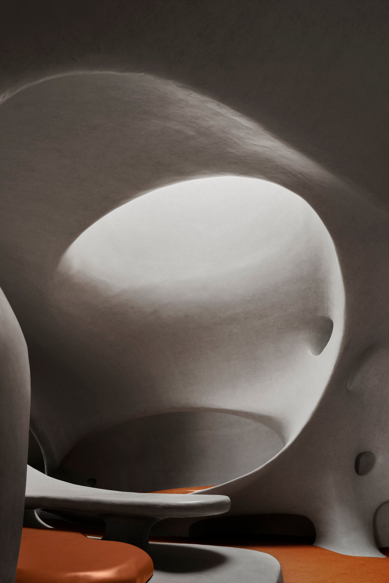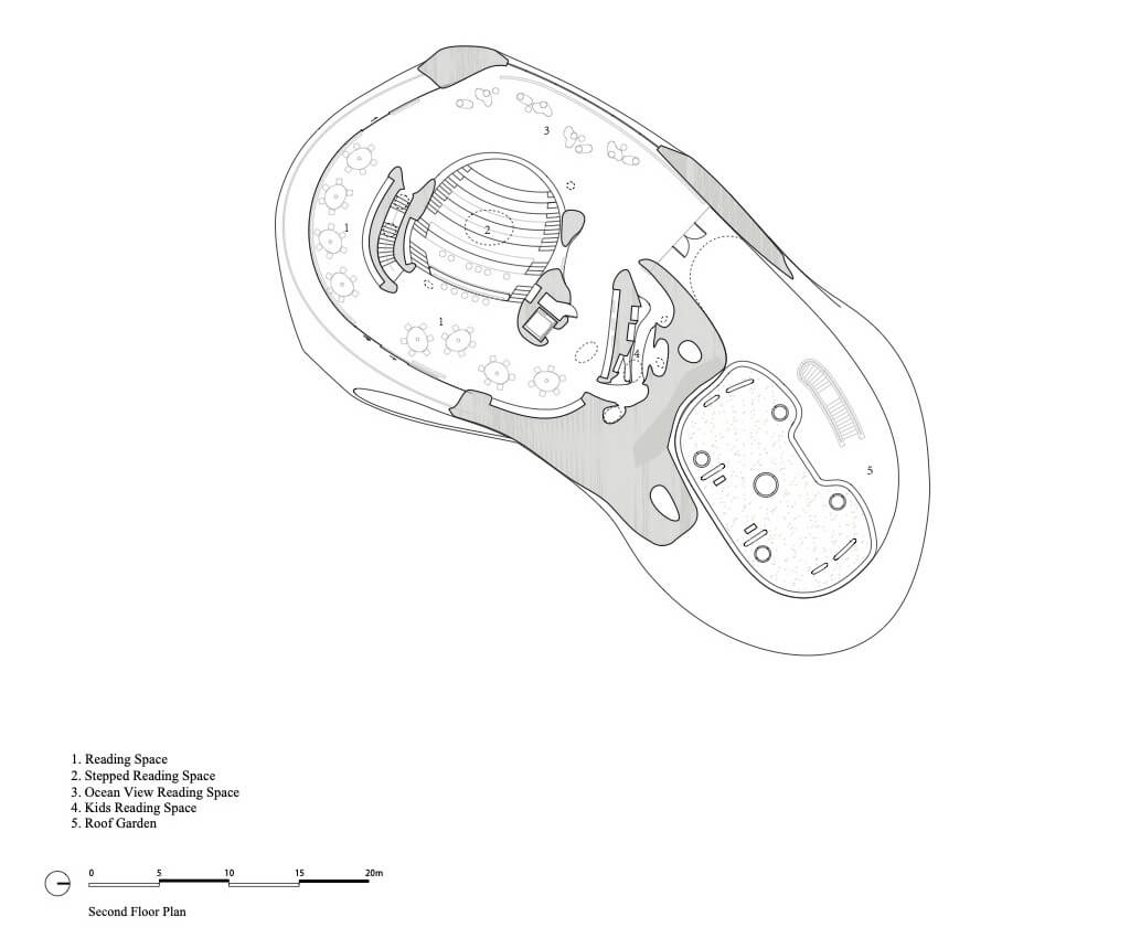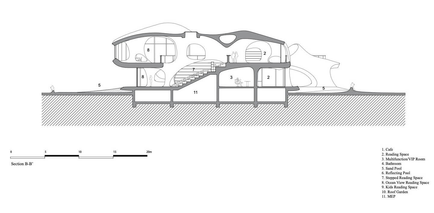 The interior and exterior were both cast in fair-faced concrete, an advanced, smoother material that was manufactured by Yihuida Shmizu Concrete. All joints and surfaces are free-cast and exhibit no right angles, proving to be one of the most challenging cast-in-place fair-faced concrete projects in the province of Hainan Province. The building’s roof and floors used beamless slabs, while the interior of the building utilizes double-layered waffle slabs that are irregularly shaped to help reduce the dead load and make it easier to fit electrical systems with the structure. All plumbing, electrical, and mechanical systems are hidden within the concrete cavity to maximize the visual consistency in the material throughout the project. MAD Architects work with facade consultants RFR Shanghai, who they also collaborated with on the similarly sinuous Chaoyang Park Plaza in Beijing.