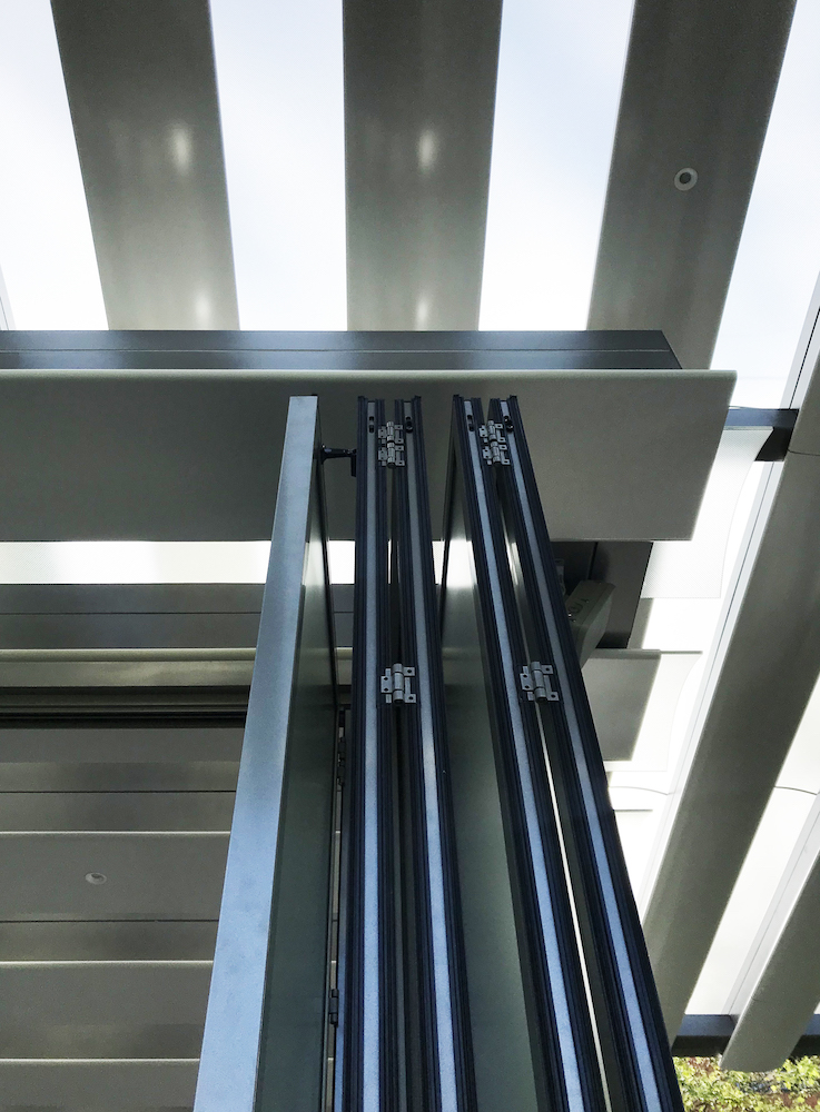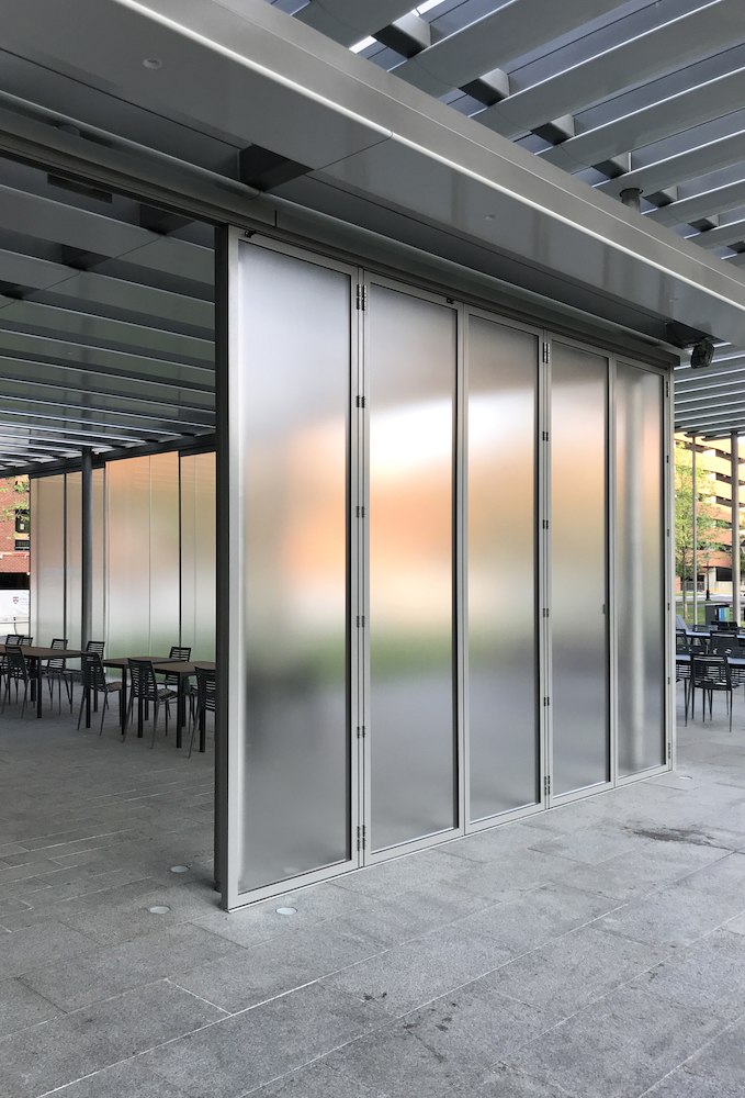 Efforts to maintain comfortable distances and bring the outdoors in are made easier with metal and laminated-glass operable doors, including frameless, top-hung sliding panels on the south side and at the northeast corner and folding/sliding doors on the west side. Fabricated by SUNFLEX Wall Systems, the lightweight deployable doors can be easily refigured, depending on privacy needs, event size, and weather conditions. (The structure relies on passive heating and cooling and is sited to account for that.)