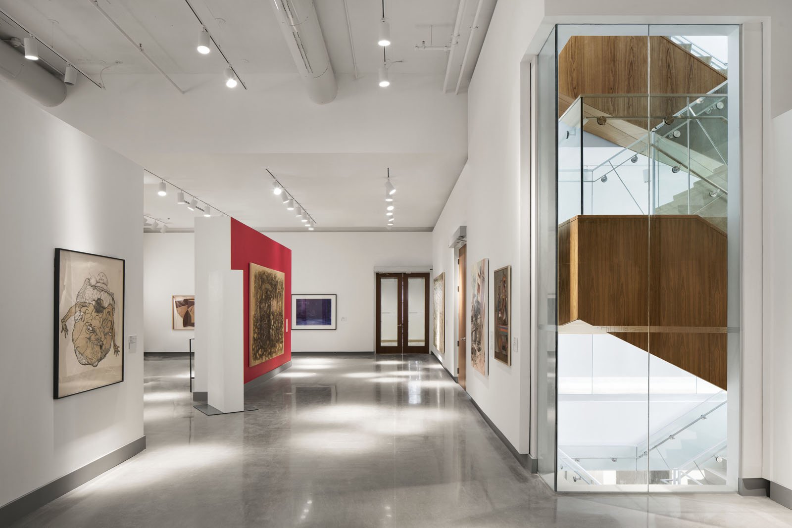 The primary facade of the Gallery is an expanded metal mesh suspended in front of an inexpensive metal siding. KPMB conceptualized it as a levitating box acting as a beacon for the city, and the volume contains the art galleries and administration space. Because the galleries require indirect natural light, the design includes strategically placed windows for controlled daylight into special galleries and for clear orientation in the central staircase.