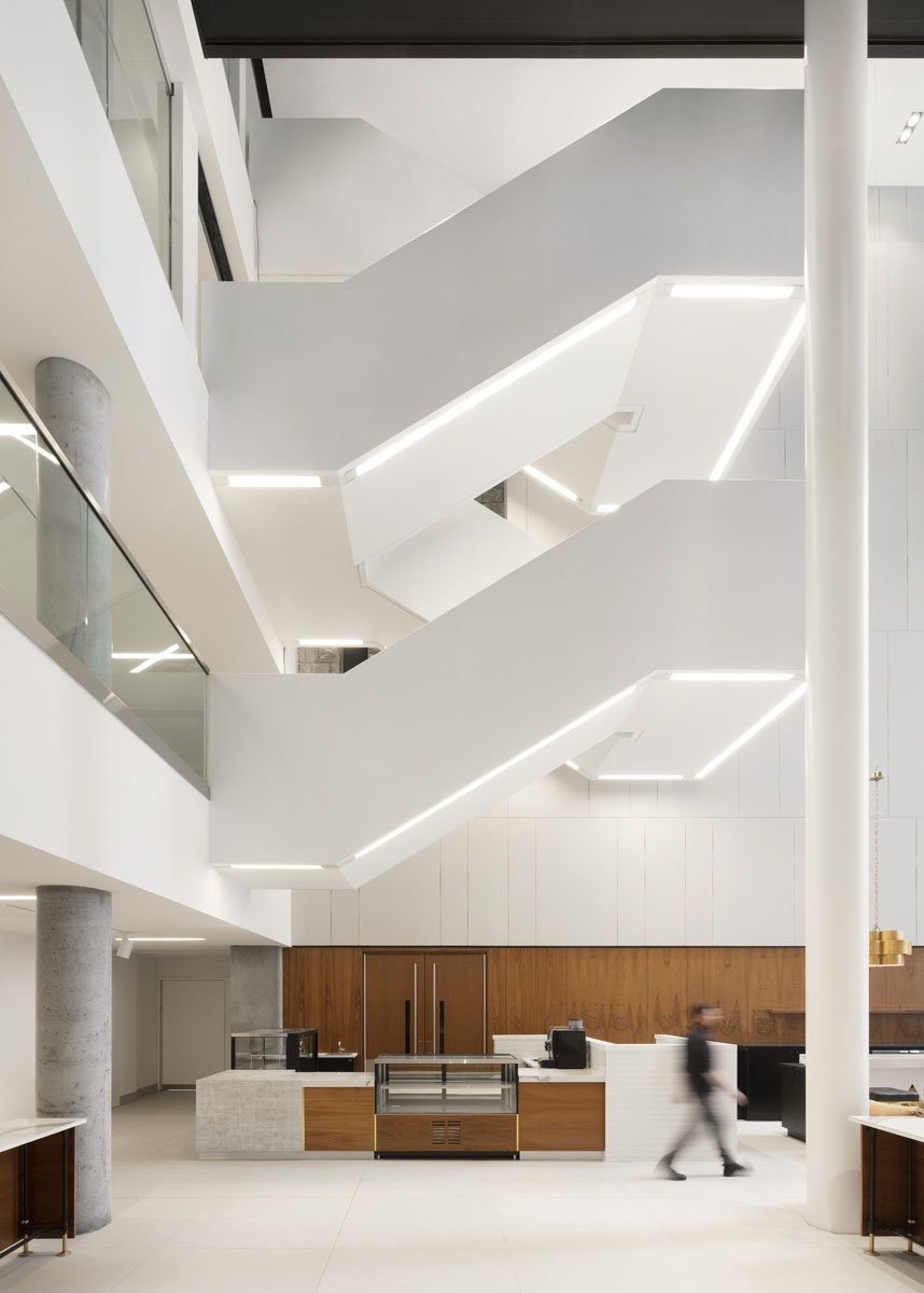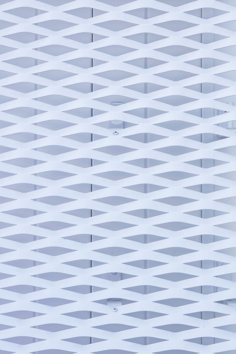KPMB began the design with a custom perforated mesh in mind but, due to cost restrictions, they were forced to investigate other options, including back-painted glass and perforated metal fins. Ultimately, the project team arrived at the expanded metal mesh because it was the simplest way to maintain the original design intent while still being cost effective.