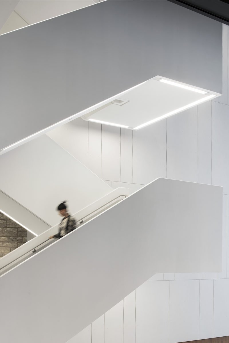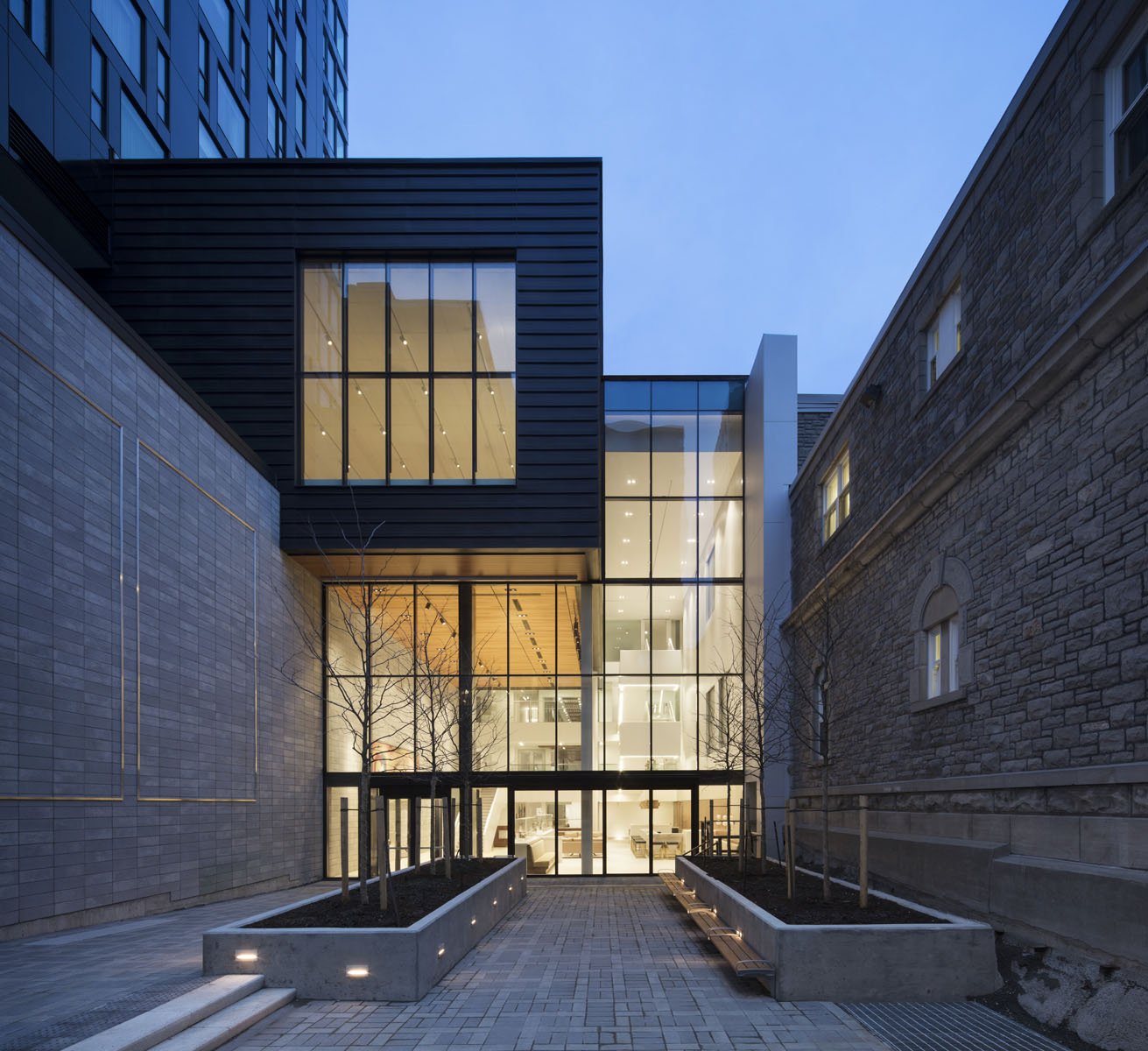 The black box theatre and the multi-purpose room intersect with the art gallery’s space and use contrasting materials. The theatre volume, which houses the University of Ottawa’s drama program, is clad in a charcoal-colored block that references the neighboring historic stone walls. On the north side of the new complex, above the entry court and atrium, the multi-purpose room is clad in anthracite-colored zinc.