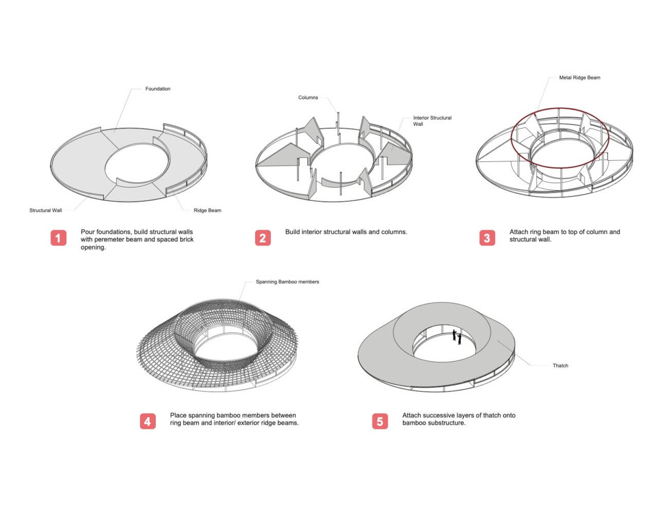 An inversion of the traditional pitched roof, the sloping crown is comprised of local reed thatch that greatly improves the climactic control of the extreme heat in this region. A “stack effect” forces hot air into the peak of the roof while mediating colder air into the classroom space below. This passive cooling strategy keeps the interior 20 degrees cooler than its exterior environment. A hidden metal ridge beam with a bamboo substructure supports the roof. Additionally, the thatched roof is pitched at a 45-degree angle, covering most of the brick facade, in order to maximize rainwater runoff and direct it to an existing aquifer.
