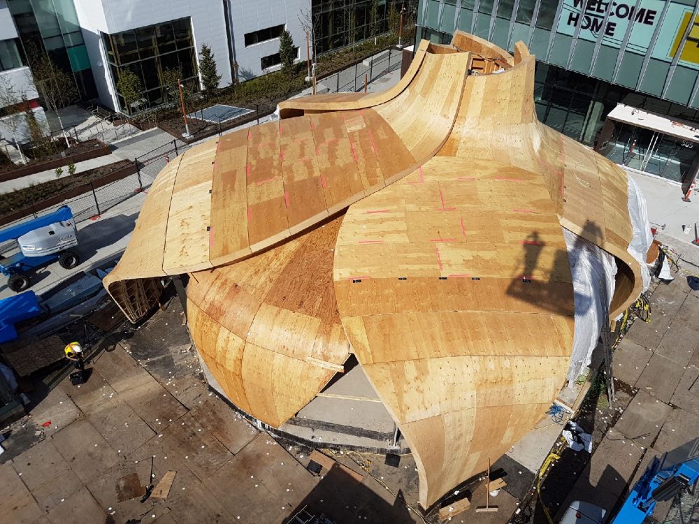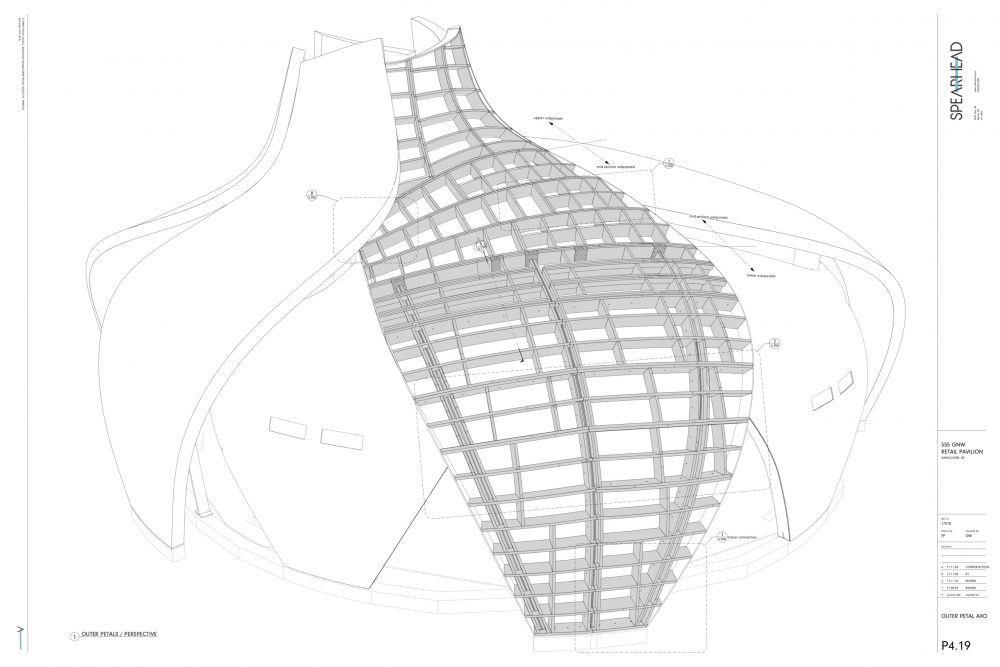 Blackcomb Facade Technology, a frequent Spearhead collaborator with particular expertise in complex assemblies and hybrid structures, handled the five curved glazed bays for the pavilion using a RAICO Therm+ A-I system with Guardian SunGuard glass.