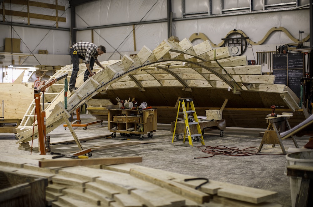 Streamlining the broad contours of the pavilion did not diminish the project’s hybrid, kit-of-parts complexity. The shear wall system consists of curved plate steel reinforced with glulam on either side, while the slender profile of the upper roof layer relies on CNC-cut plate steel columns laterally supported by engineered wood components. Both the roof diaphragm and the shear wall system are sheathed in plywood; moments of extreme curvature are decked with layers of thin plywood laminated together. Narrow strips of birch plywood were applied to the interior and overlap as curved drop siding. In total, there are approximately 6,950 custom CNC-cut wood components, 875 custom CNC structural steel parts, and 1,350 Simpson brackets.