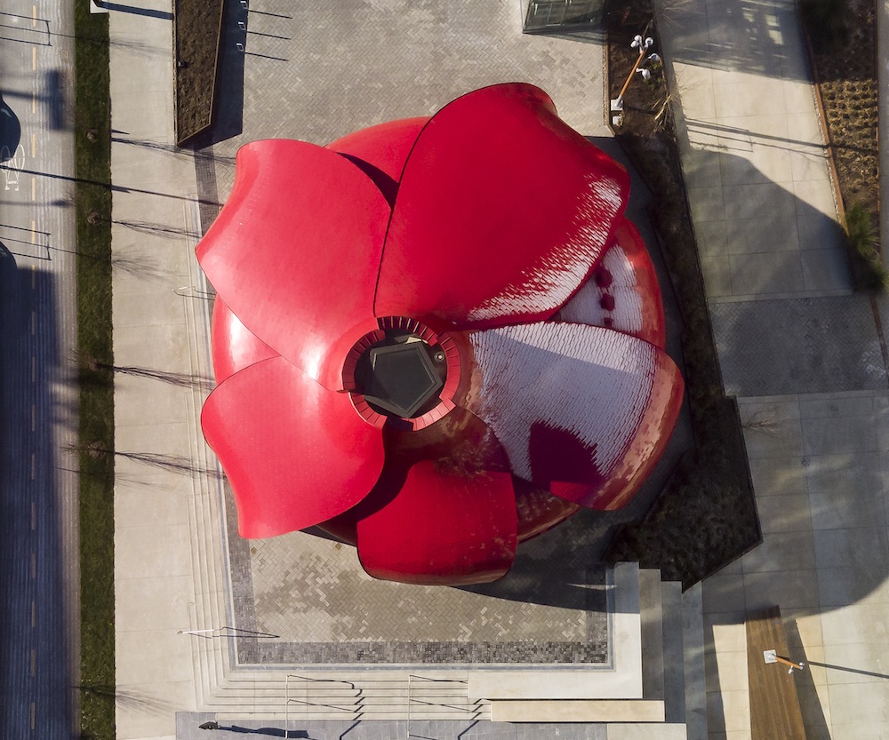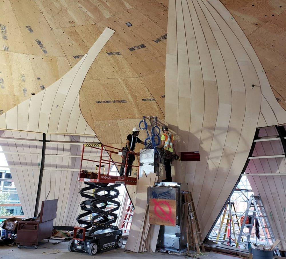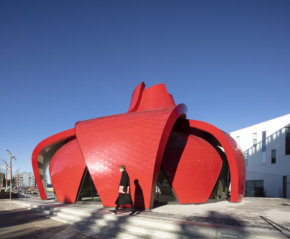 The primary elements of the pavilion are ten overlapping curved “petals” clad in bright-red aluminum composite shingles. The petals are just over 30 feet tall and frame a central, glazed oculus. Initially, the architects sought to achieve the flowing form with nail-laminated timber panels—stacked dimensional lumber held together with nails—shaped by 5-axis CNC sculpting. With a budget of only $1.4 million, however, this method proved cost-prohibitive. Instead, Spearhead developed a waffle framing model built from economic laminated strand lumber and glulam sculpted with a 3-axis CNC machine, an approach that significantly reduced the volume of material required for the pavilion and facilitated the straightforward installation of insulation and MEP infrastructure.