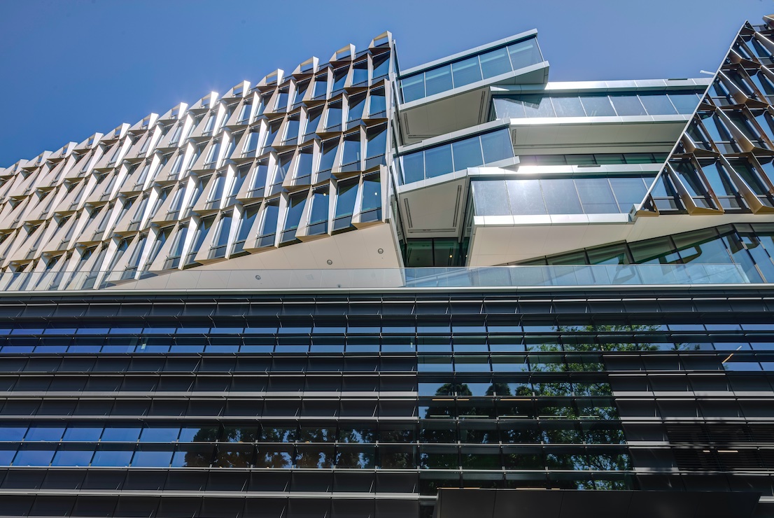 A light-filled, triple-height atrium welcomes patients, students, and visitors to the Susan Wakil Health Building, a new satellite of the University of Sydney. Designed by Diller Scofidio + Renfro and Billard Leece Partnership, the healthcare hub consolidates teaching, research, and clinical functions under one roof. At more than 231,000 square feet, the project footprint is sprawling, and the massing, which responds to local site conditions, complex. But it’s the upper building volume, with its faceted, mustard-yellow facade, that gives the campus its identity.