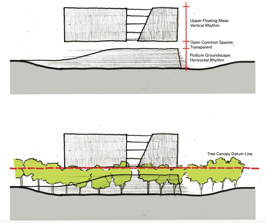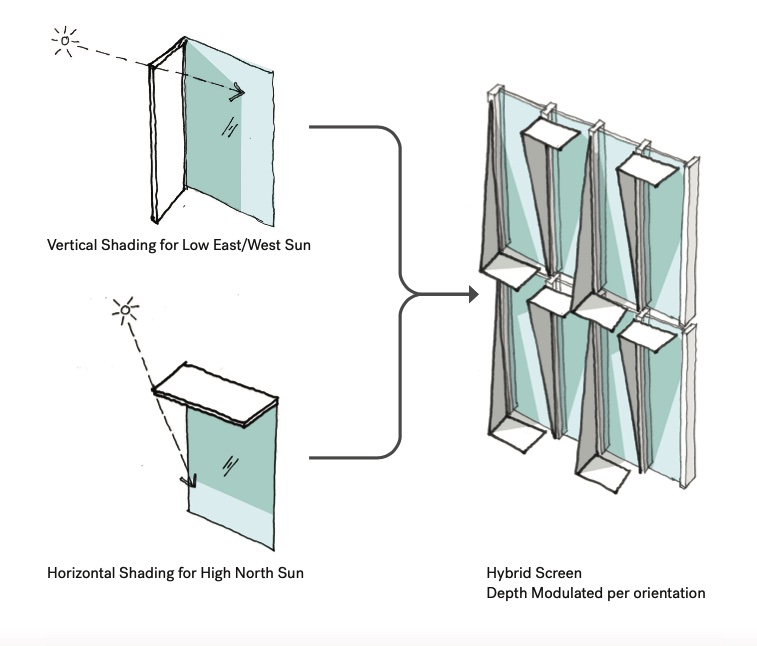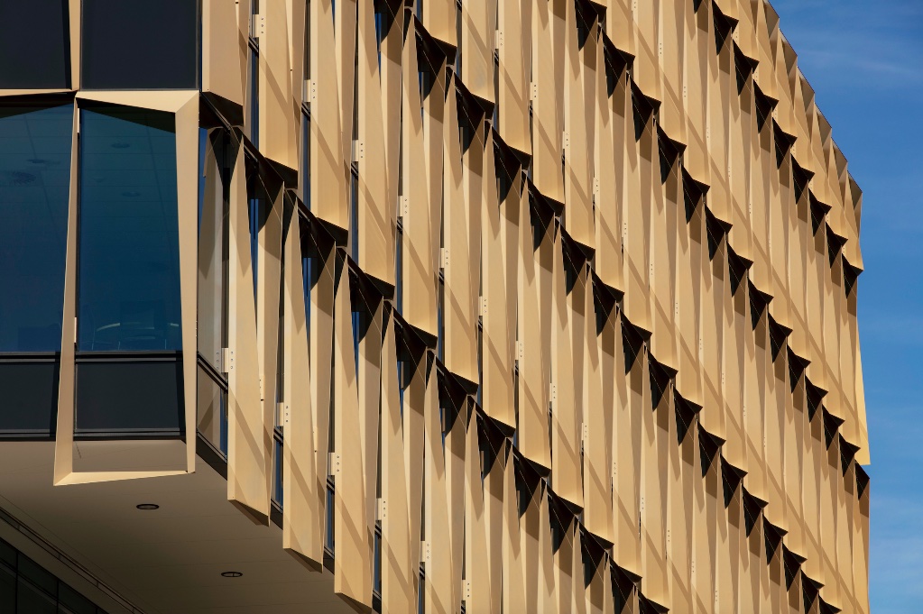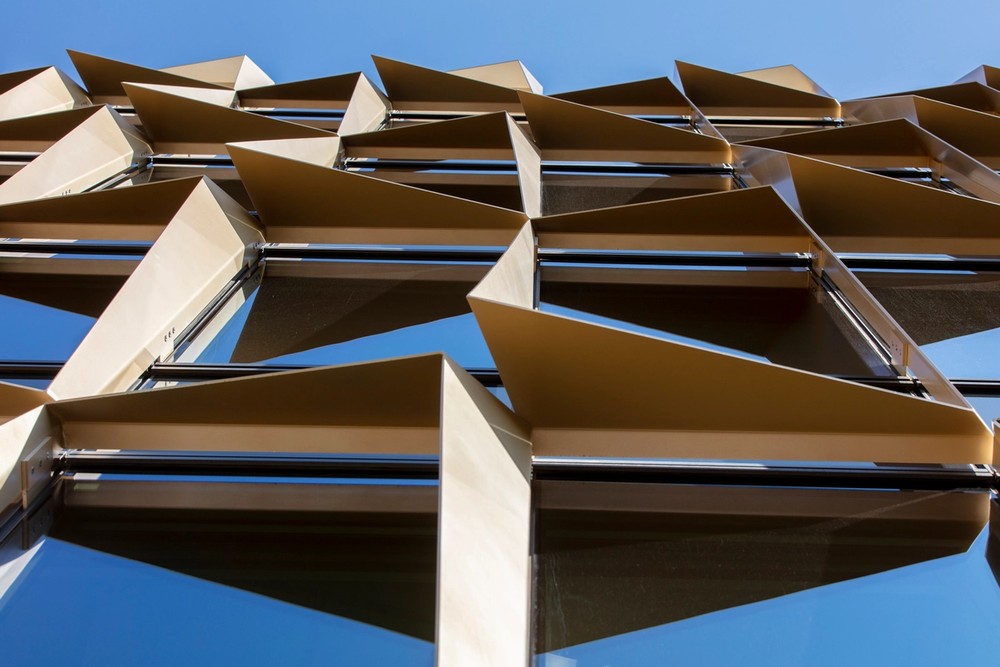 Simple glazing wraps much of the ground-floor podium, although this is supplemented in areas by horizontal ceramic panels and aluminum screens. A large, multistory volume rests atop this podium, with angular shading panels distinguishing the former from the latter. These deep-yellow porcelain fins are 5′-9” wide and are hung from the slab edge with concrete embedded brackets. Repeated over large spans of the buildings, the standardized facade elements create a subtle, but palpable rhythm.