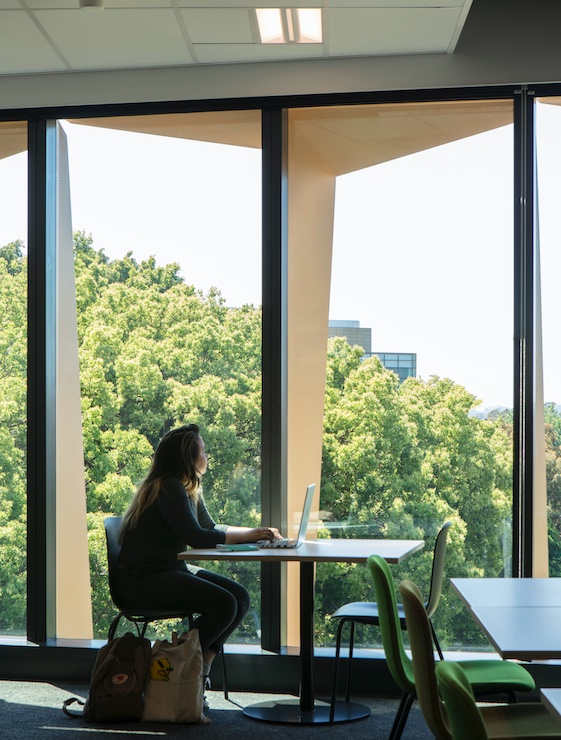 Situated on the historic land of the indigenous Gadigal people, the building incorporates landscaping elements in accordance with the university’s Wingara Mura design principles. A tripartite massing strategy, with a podium and upper volume sandwiching a layer of common spaces, helps to organize the multi-pronged program in a legible manner, while also ensuring that the different departments had easy access to outdoor space. Foremost among these, said Benjamin Gilmartin, partner at DS+R, is the Upper Wakil Garden, which adapts a traditional college yard for the vertical format. A “cleave” in the upper volume, Gilmartin added, “draws light down into the garden throughout the year, while its interlacing circulation acts as a connective tissue between academic workplaces and clinical spaces within.”