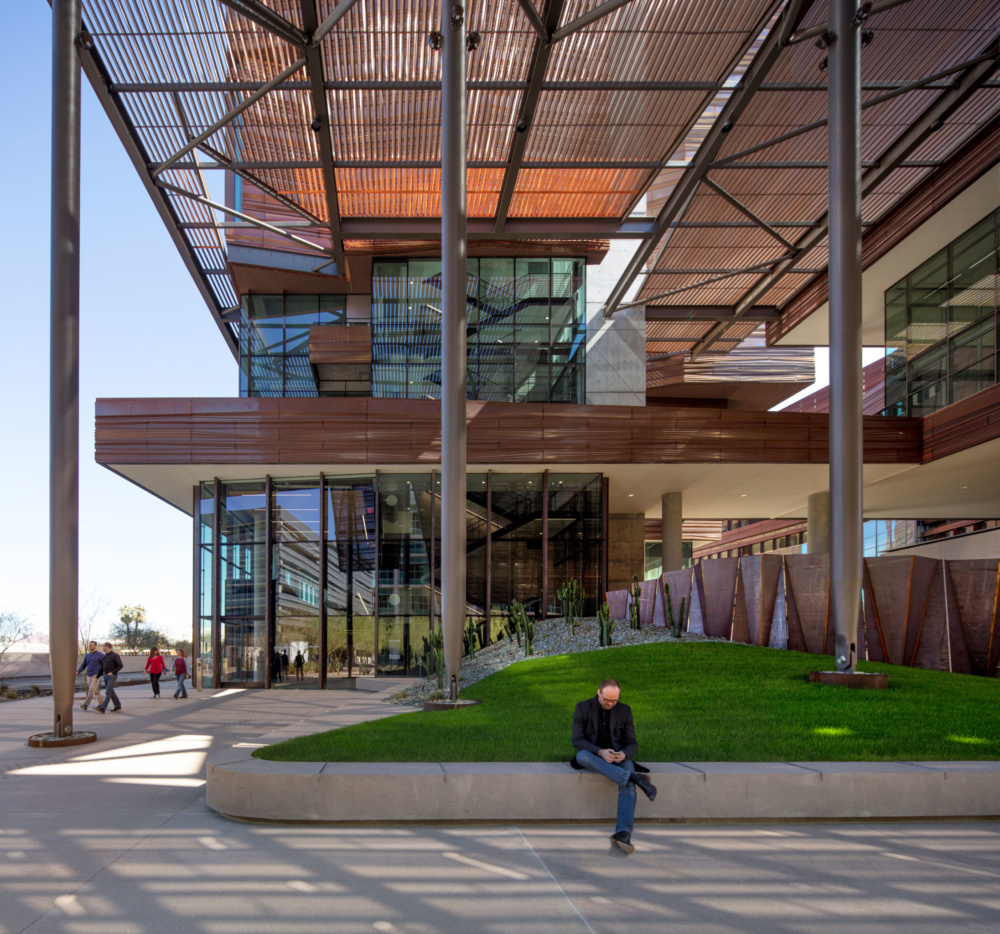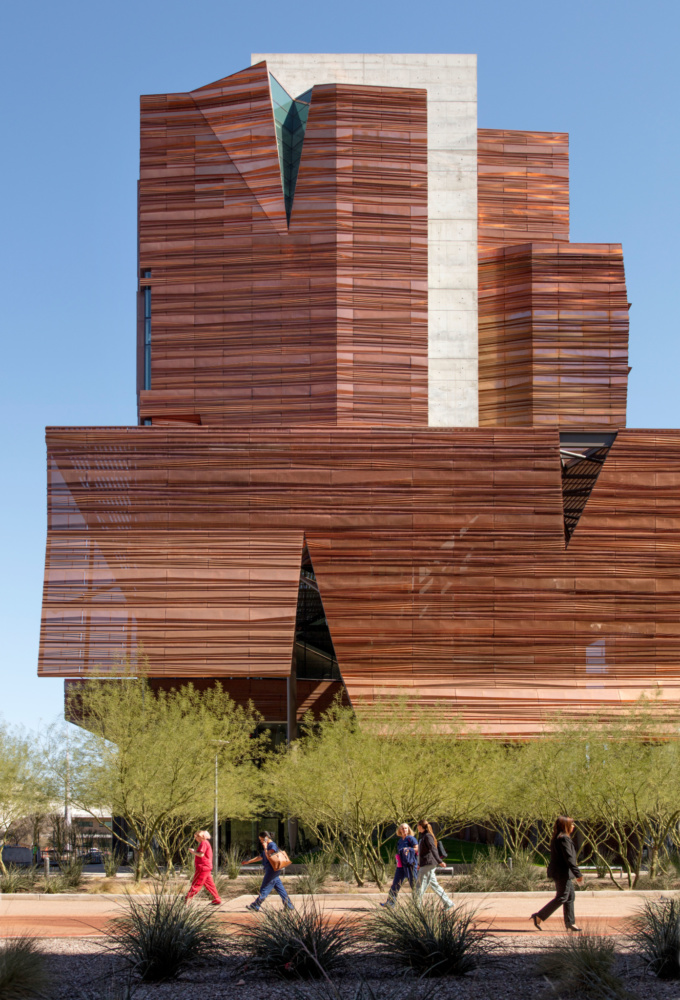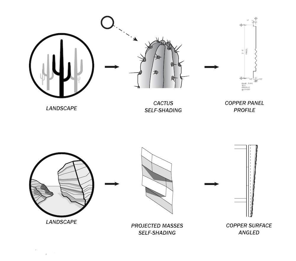 For the design of the building’s envelope, CO Architects analyzed and incorporated the natural features of the surrounding Sonoran Desert. Specifically, folds within the copper panels are intended to reflect the physical traits of the Saguaro Cactus. The skin of the cactus undulates as a means of self-shading so the successive floors of panels on the facade protrude to mimic geological striations while also shading bands of fenestration below.