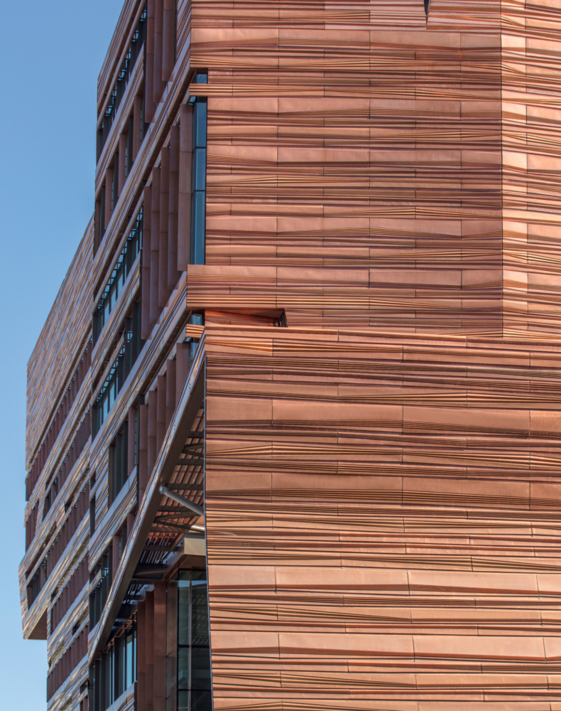 Kovach Building Enclosures, based out of Arizona, manufactured and installed the facade panels. Remarkably, over 90 percent of the cladding was fabricated with recycled copper—ranging from multi-ton ingots to gauged coils.
