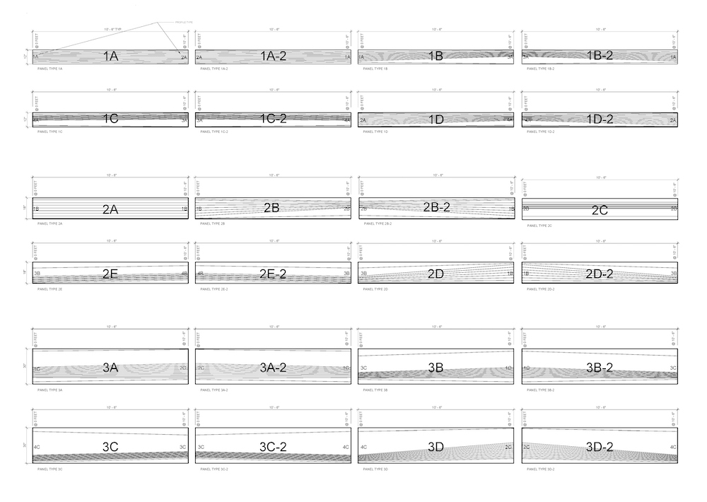 To this effect, the design team generated six groups of panel types—each is comprised of four modules of the same height and width. Modules within specific panel types were alternated to display a breadth of visual striations.