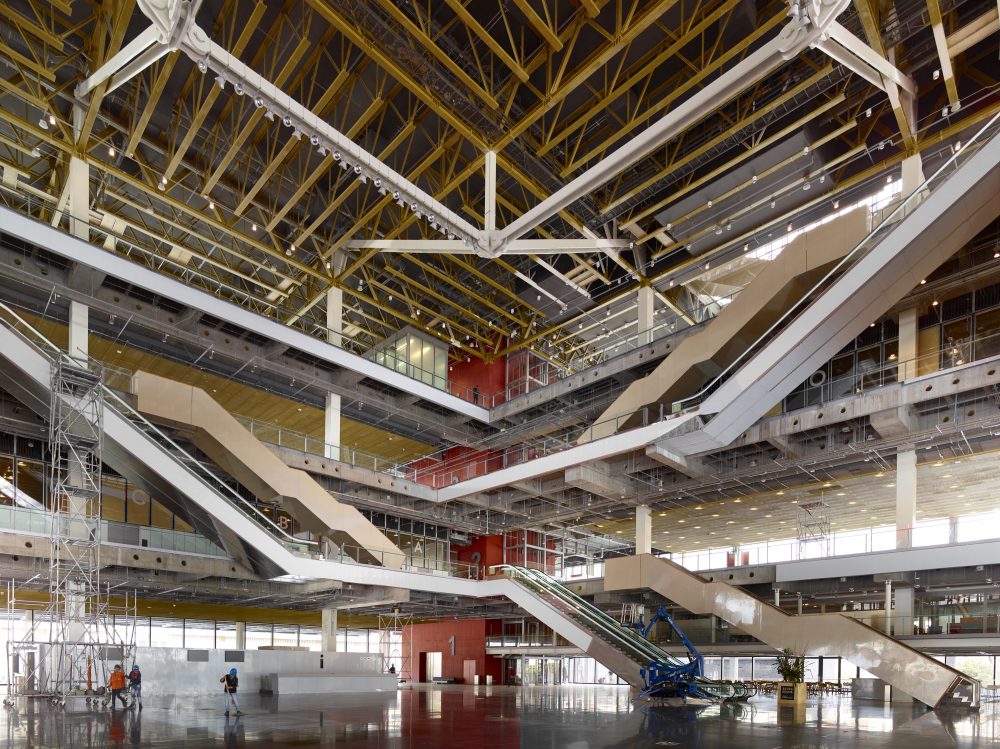 The 1,600-panel cladding system is tied to the overall structure via a network of large modular aluminum frames, with the glass panels ranging in size from approximately 4.5 feet by 8 feet, to 8 feet by 35 feet. According to the design team “the facade panels are mainly fastened by three-dimensional anchor elements made of stainless steel specifically designed for the project, being screwed to the edge of concrete slabs or being welded to the metal structure.”