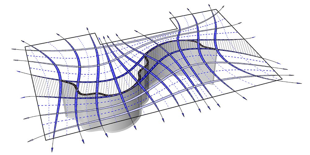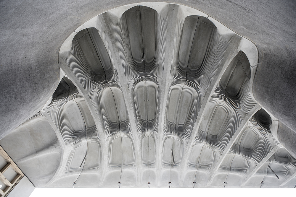 While the underbelly’s contours were formed by 3D-printed sand casts, the ribbed grid above was shaped by CNC laser-cut timber formwork. The load-bearing ribs, resulting from timber formwork, were outfitted with a series of tubes for the insertion of steel cables both horizontally and vertically. These post-tensioned ribs carry the principal load of the “Smart Slab.” In placing the principal load above the concrete shell, the research team was able to insert complex geometric features below.