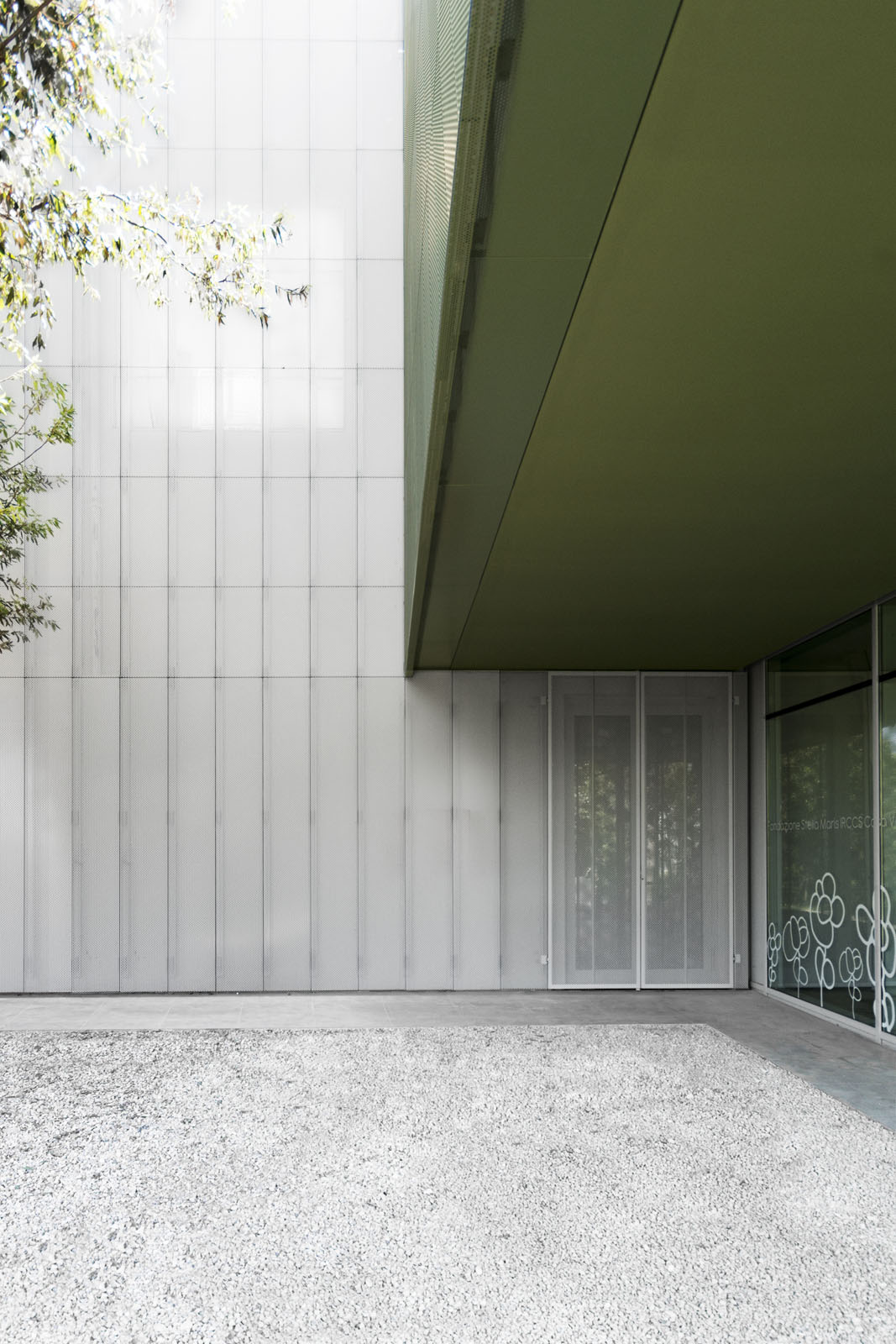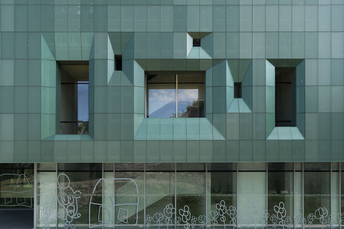 Art by and about the patients has shaped the facility. Drawings from younger patients were edited, scaled, and applied to the ground floor glazing system, while Italian artist Mercurio-S17S71 created Shamans, a contemporary work that features portraits of Casa Verde’s patients.