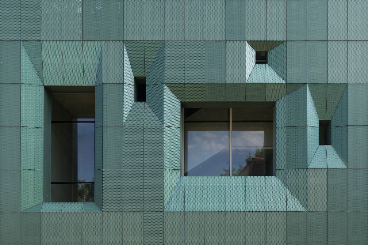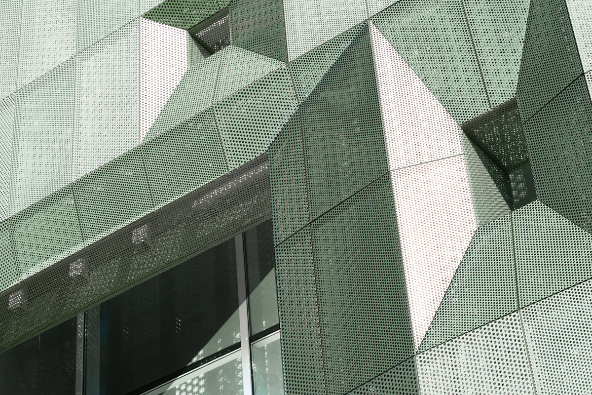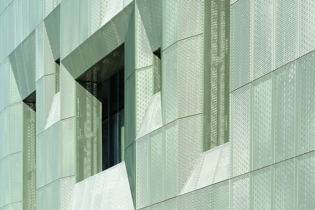 The facade coloration results from a study of leaf shades in different seasons. Like a full tree canopy, the facade’s perforated screens are perceived as porous from up close, but massive and opaque from afar. Openings in the metal panels filter daylight while ventilating the thermal envelope beyond the screen.