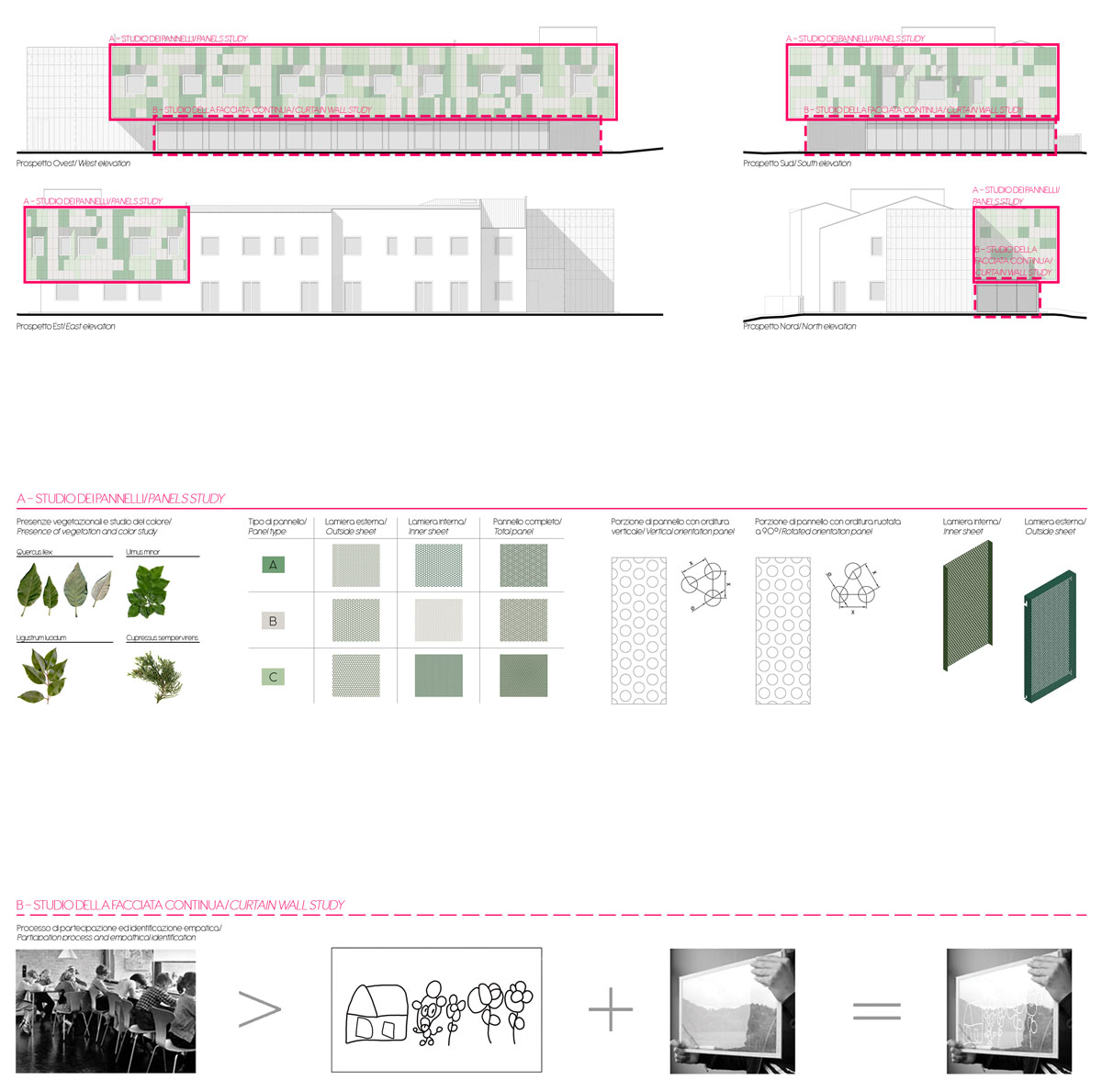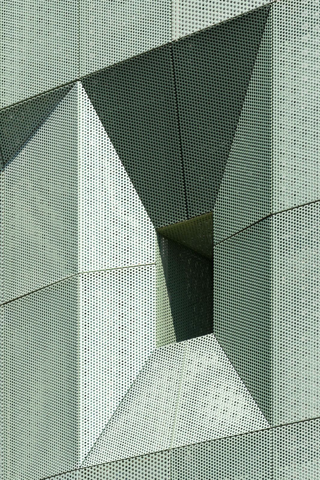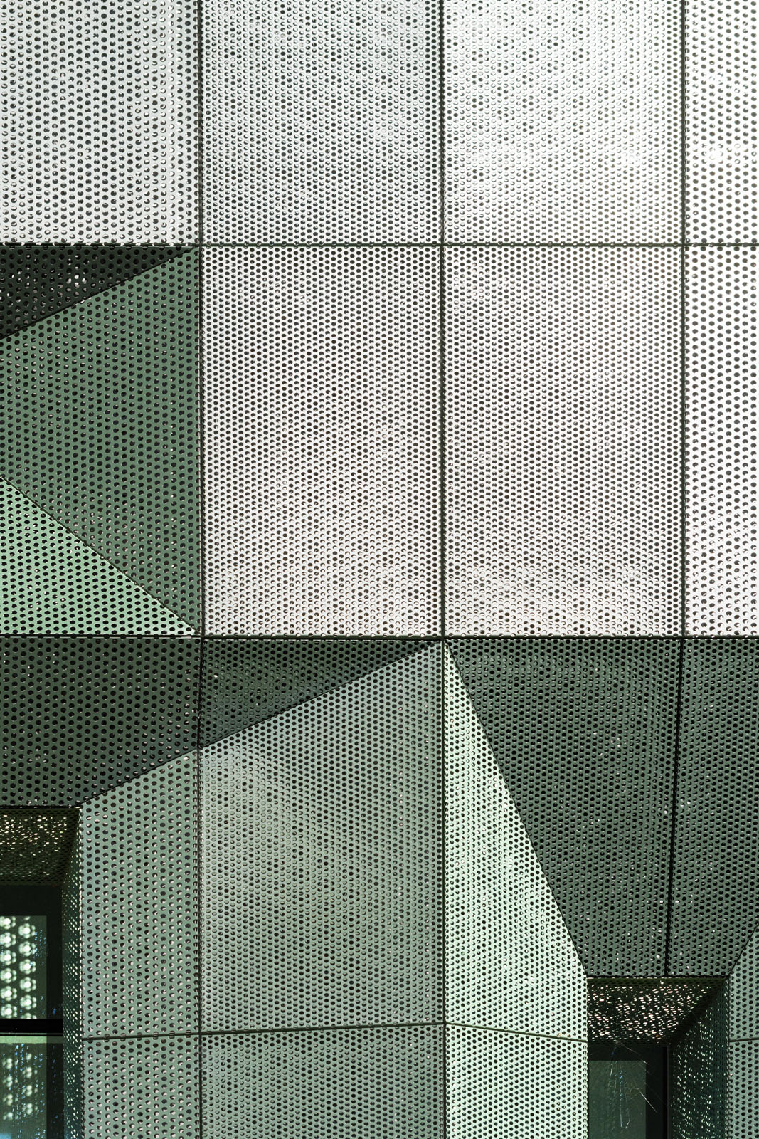 The facade coloration results from a study of leaf shades in different seasons. Like a full tree canopy, the facade’s perforated screens are perceived as porous from up close, but massive and opaque from afar. Openings in the metal panels filter daylight while ventilating the thermal envelope beyond the screen.