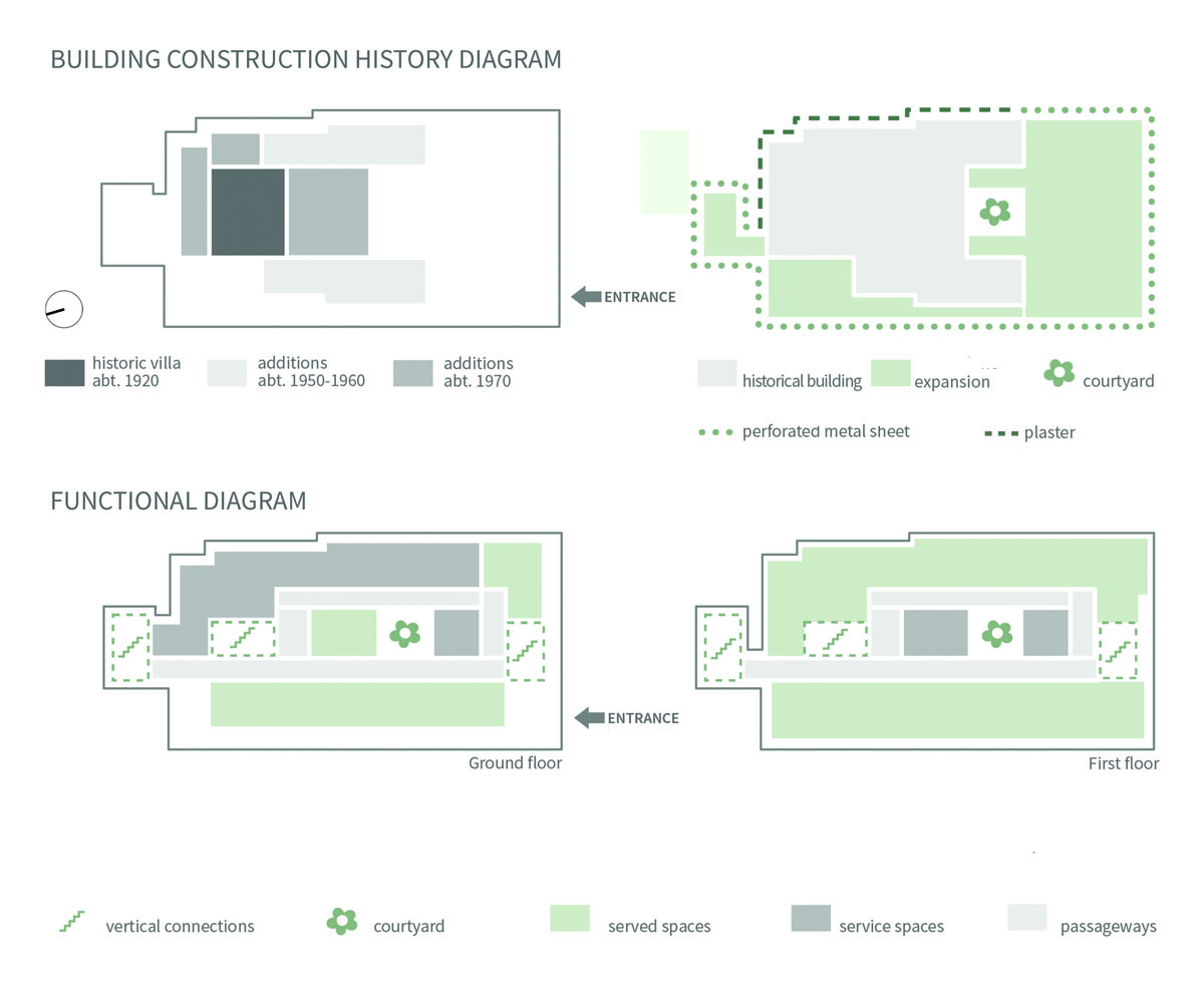 The extension to the existing orphanage was sensitively planned to protect the formal massing of the original plan, while additions to the complex are articulated through more contemporary expressions of shape and material. Openings on the main elevation connect users of the existing structure to the addition.